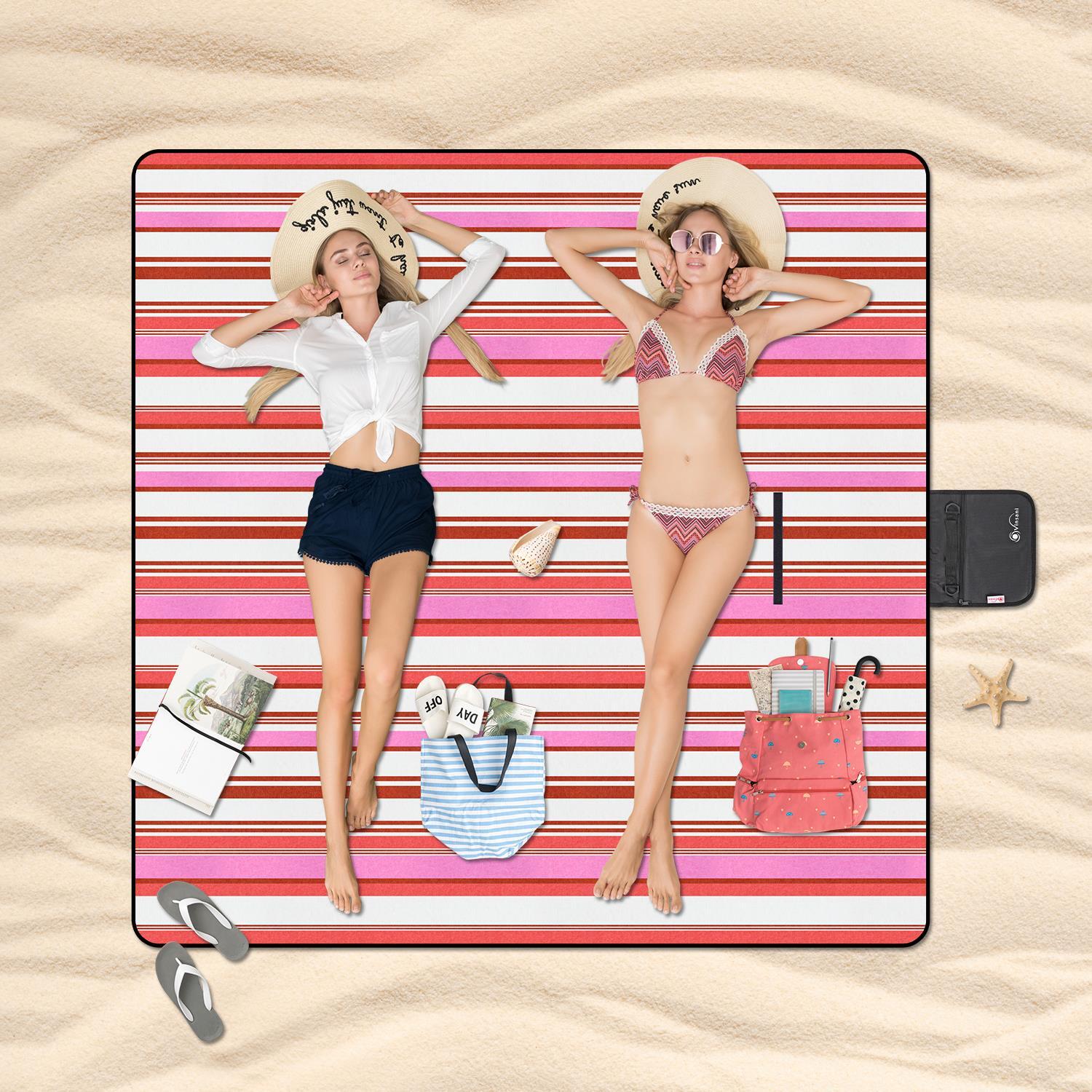 200 x 200cm Folding Picnic Blanket Waterproof & Sandproof- Pink Stripe