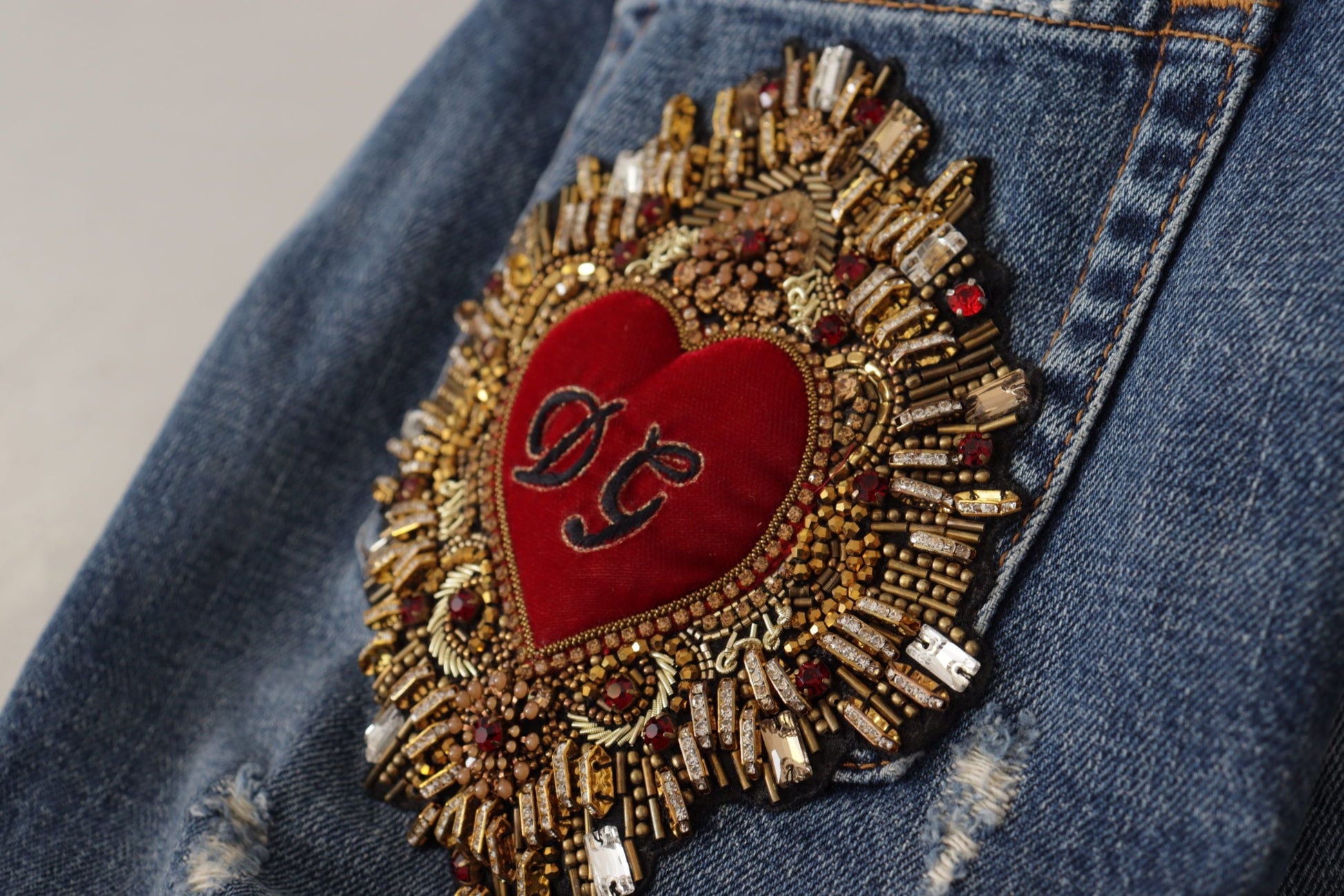 Blue Denim Baroque Heart Logo Patch Pants Jeans