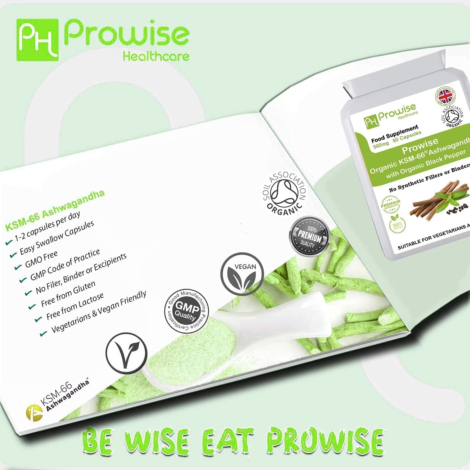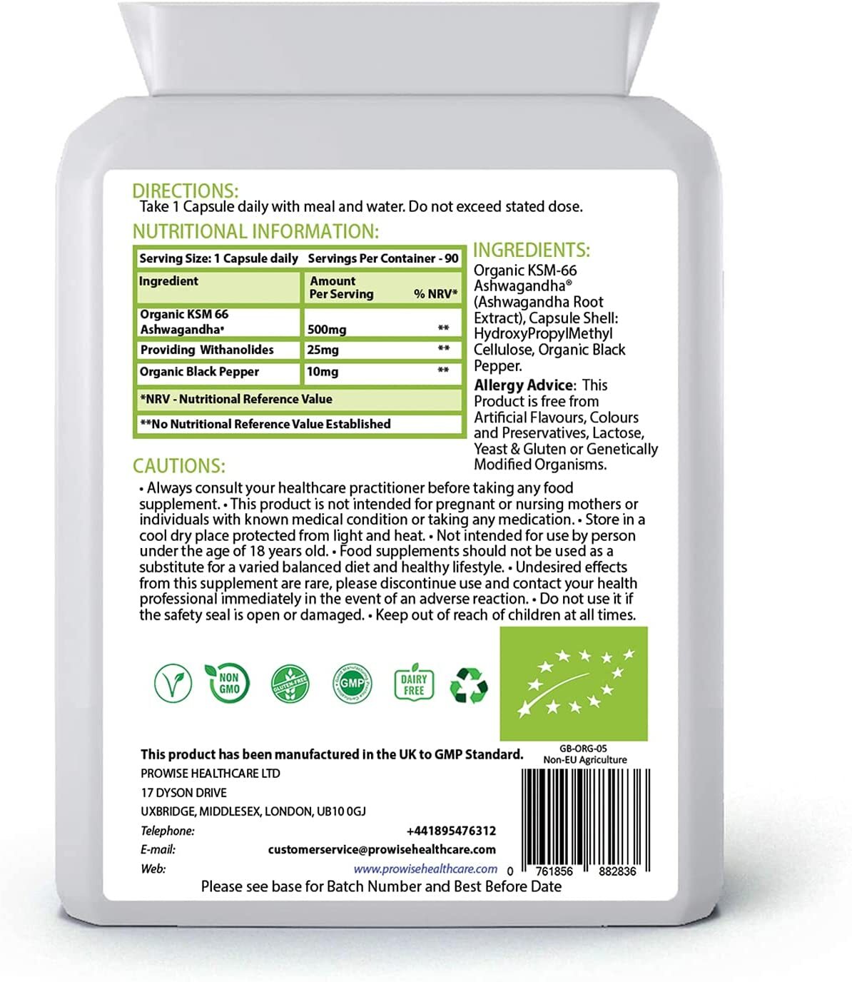 KSM-66 Ashwagandha (500mg) with Organic Black Pepper (10mg) capsules provides the highest concentration full-spectrum root extract currently on the market. Ashwagandha is the star herb of Ayurveda, the traditional system of healing in India. This herb has been known for centuries and in recent years studies have brought confirmation of the nutrient value of this potent herb.KSM-66 is a special extract of Ashwagandha root that took 14 years of R&D to perfect. It is the ashwagandha root extract with the most comprehensive support of successful research studies and clinical trials. It also has the highest percentage of withanolides of all root-only extracts available today, with more than 5% concentration of withanolides.Advance Formulation: Prowise Healthcare is proud to announce New Formulation which provide best quality KSM-66 Ashwagandha with Organic black pepper which is expertly formulated to increase the effectiveness of the supplement.Image - Apart from below attached add 2 other images1. Letter Box Freindly2. New Banner of Prowise ( Banner attached ) Highest Strength - Each Capsule contains KSM-66 Ashwagandha 500mg & Organic Black Pepper 10mg. We provide pack of 90 Capsules Advance Formulation: Prowise Healthcare is proud to announce New Formulation which provide best quality KSM-66 Ashwagandha with Organic black pepper which is expertly formulated to increase the effectiveness of the supplement. 100% Pure - We use all natural ingredients. Free from ✘lactose, ✘salt, ✘maize, ✘wheat/gluten, ✘yeast, ✘dairy, ✘artificial preservatives & colours and genetically modified organisms (✘GMOs).UK Manufactured - Product is been manufactured in UK which offers peace of mind to our customers.DIRECTIONS:Take 1-2 capsules daily with food.INGREDIENTS:Ashwagandha KSM-66 500mg, Organic Black Pepper 10mg, Rice Flour, Hydroxypropyl Methylcellulose (HPMC) Capsule Shell.