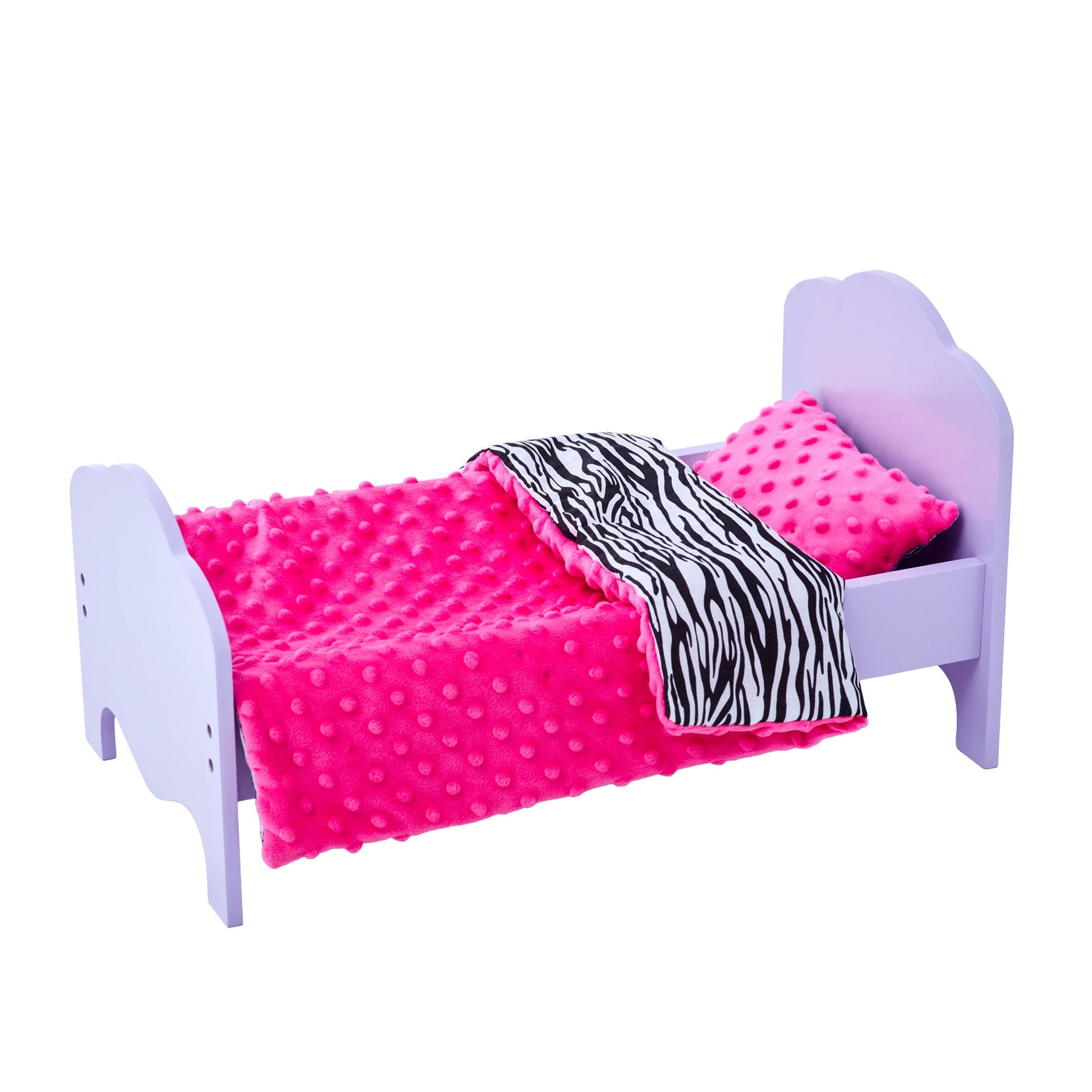 Your children have already experienced the one of a kind and substantial quality of our products, why not give their dolls something to rant and rave about now too? The purple bed comes equipped with matching head and foot board and silky reversible pillow and reversible comforter of hot pink on one side and a funky zebra pattern on the other.