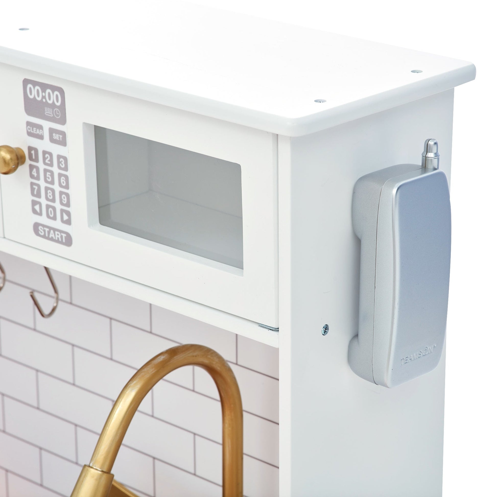 Children love helping their parents in the kitchen. Baking and cooking are fun activities for them to share with their parents family members and friends. Offer them a chance to continue the fun when no one is around to help and to explore what it is like to cook and bake with their very own pretend play kitchen. The Little Chef Boston Modern Play Kitchen features a crisp white kitchen with a faux white brick wall on the backsplash and the accent colour of brass of all the hardware. The kitchen has nine accessories: a mitt a phone a pot a pan salt and pepper shakers and utensils. Your little one will love cooking with this kitchen and pretending they are creating you the feast of a lifetime!