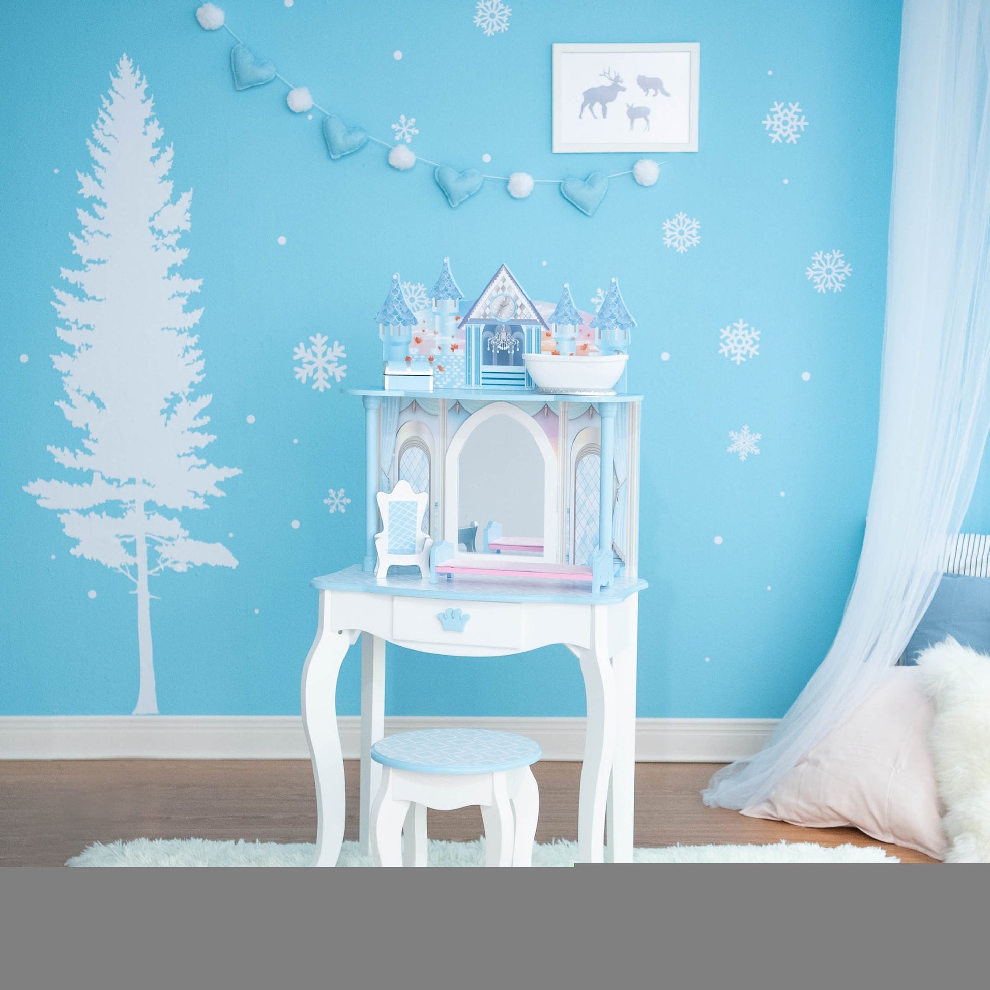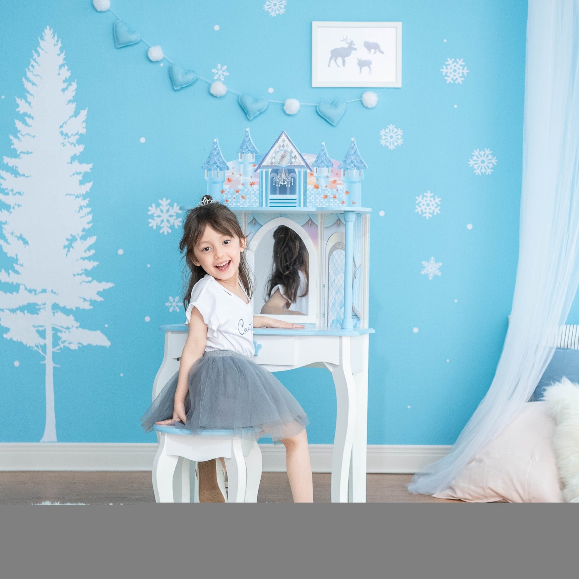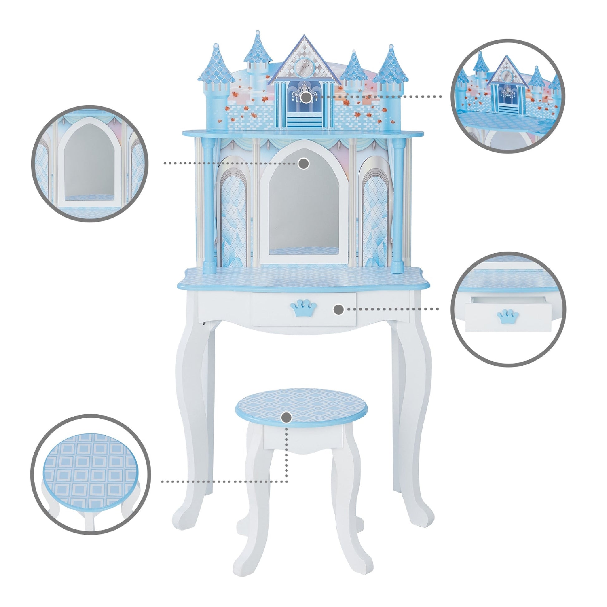 Looking for a gift to amaze and delight your little one? Give them the gift fitfor a princess or a prince with the Dreamland Castle Vanity Table and Stool Set. Vanity is like no other with a renaissance inspired castle sitting atop the vanity. Children can play and imagine that they are getting ready to become the belle of the ball here. The stool is a perfect match and features a sturdy and secure place for little ones to get ready for their pretend royal party.
