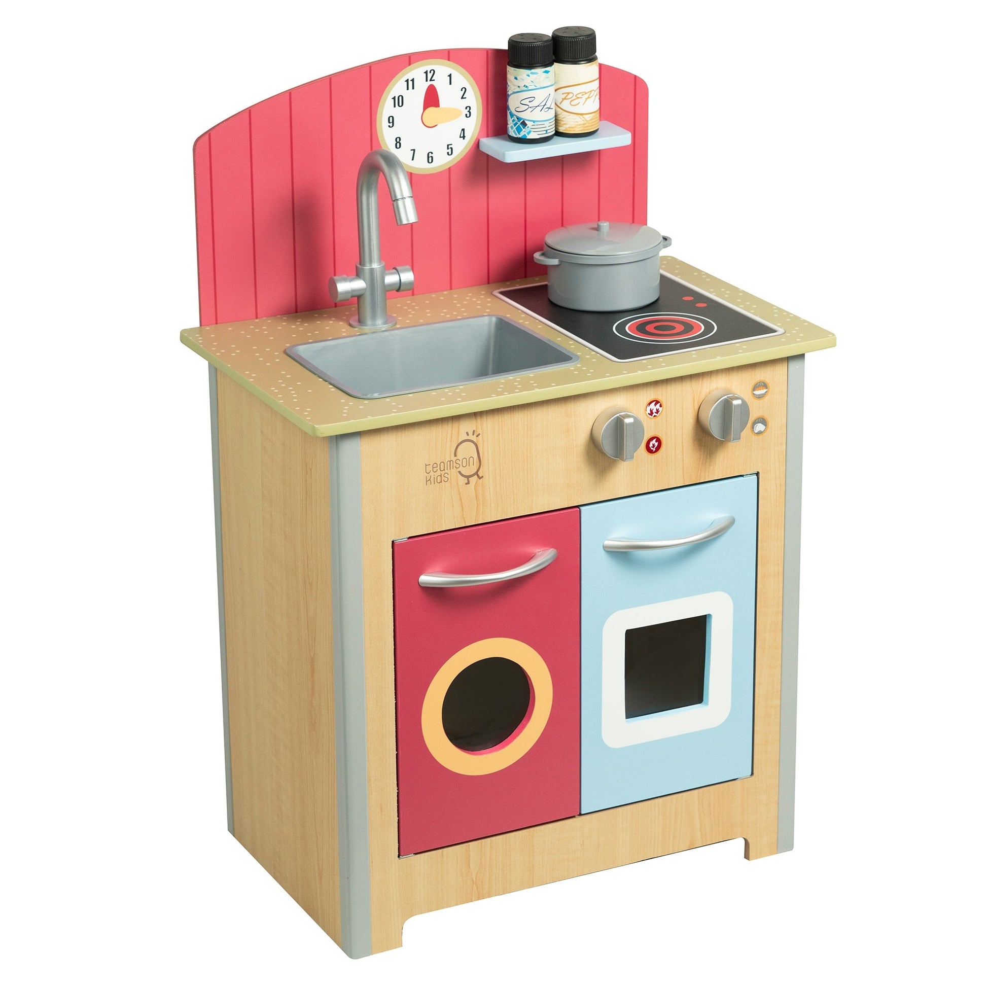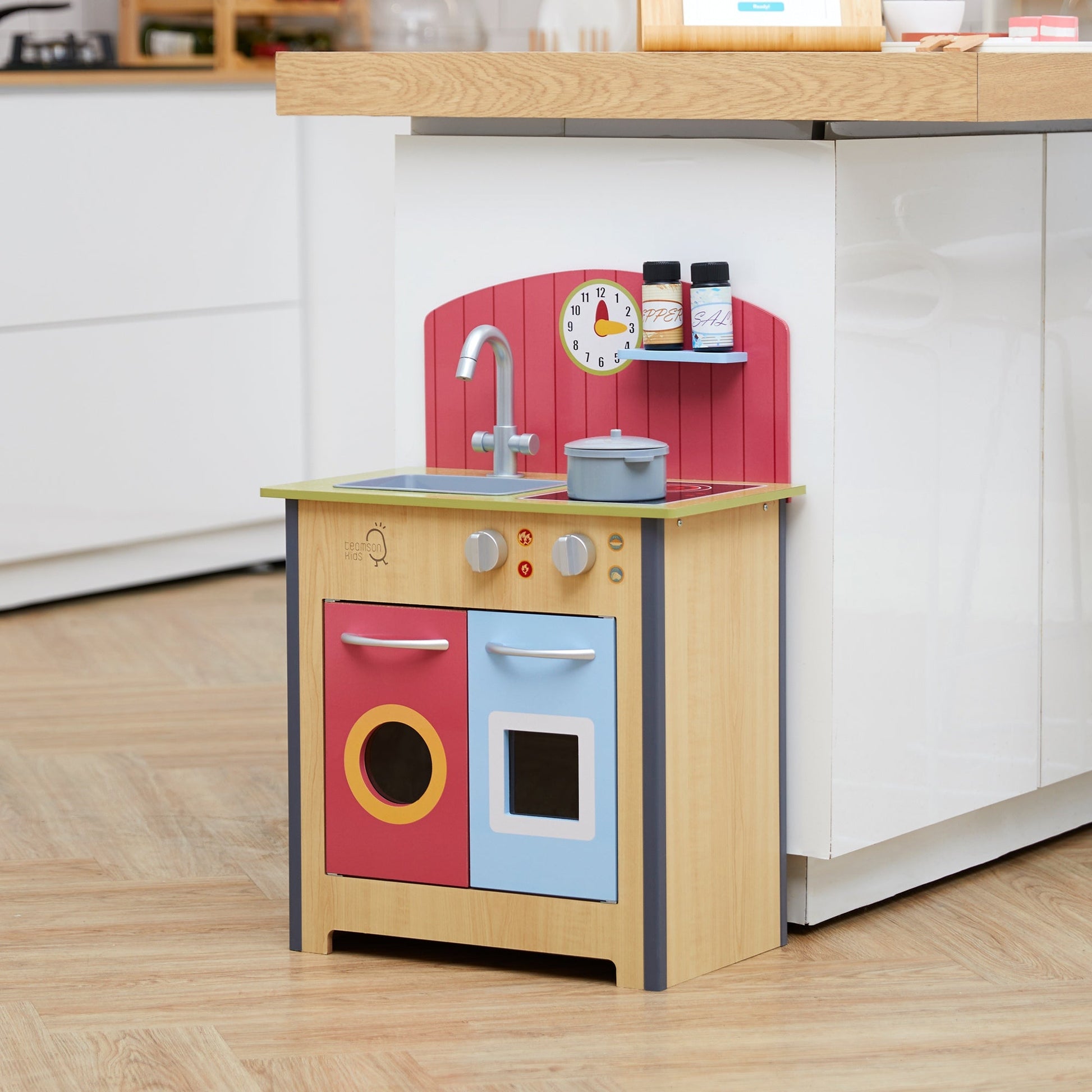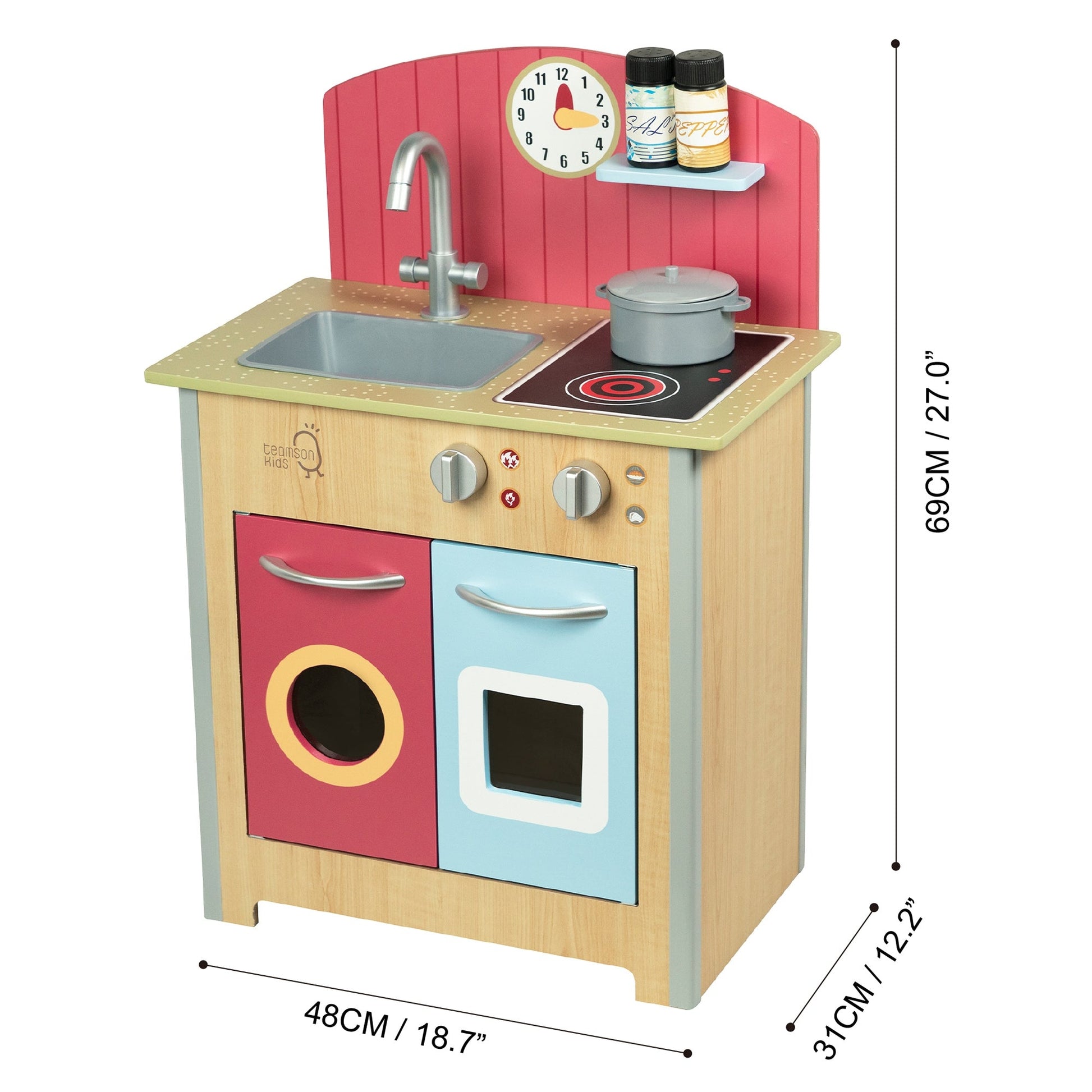 Our most compact and bijou kids' kitchen yet! The Teamson Kids Little Chef Porto Kids Kitchen Playset is the perfect space saving option we offer, with no compromise on quality or interactivity with all the fun to keep your child captive for hours. This classic-style play kitchen features a natural finish with bright red and light blue highlights, making it great for both boys and girls, and it completes any home, classroom, preschool, or daycare playroom. The functional and interactive design features two open/close doors, two rotating and clicking oven knobs, two printed induction burners, a removable sink with faucet, a spice rack shelf, and a clock to enhance your little one's play time. With 4 included accessories - a plastic pot with lid and salt and pepper shaker bottles - this toddler kitchen encourages role play and lights up your little chef's imagination and creativity. The durable wooden construction is kid-safe and easy to wipe clean for every day messes. The easy-to-follow instructions allow for quick adult assembly so play time can start right away. This kid-sized kitchen measures L47.6 x W31.1 x H68.6 cm and is recommended for children ages 3 years and up.