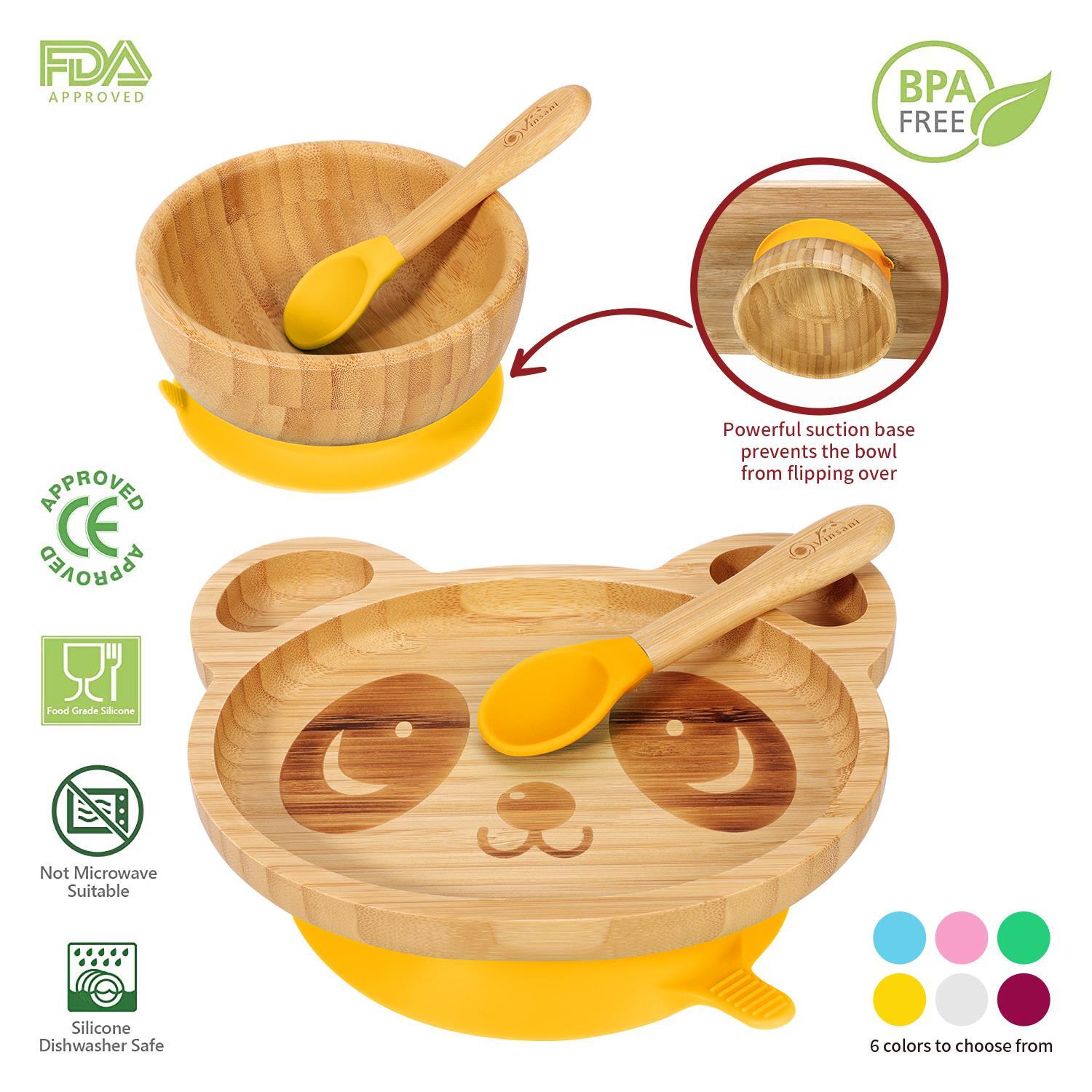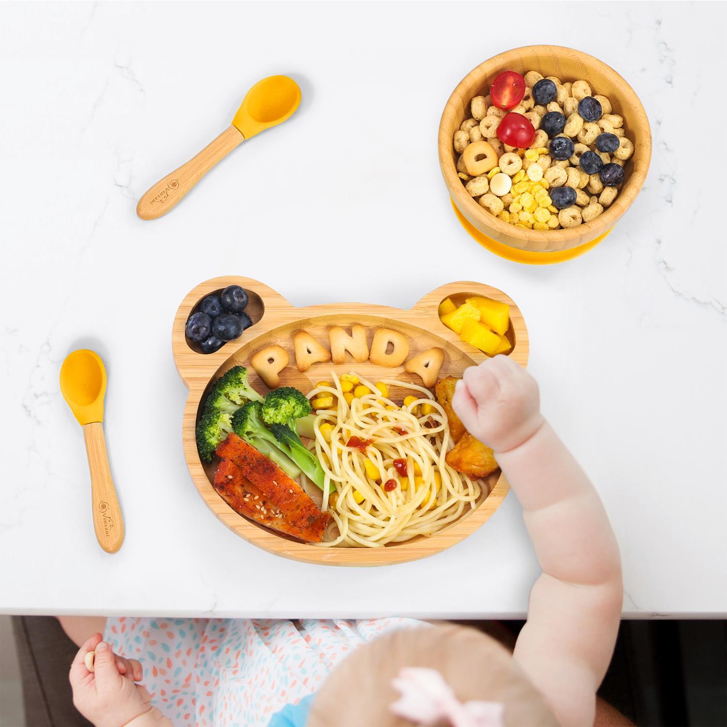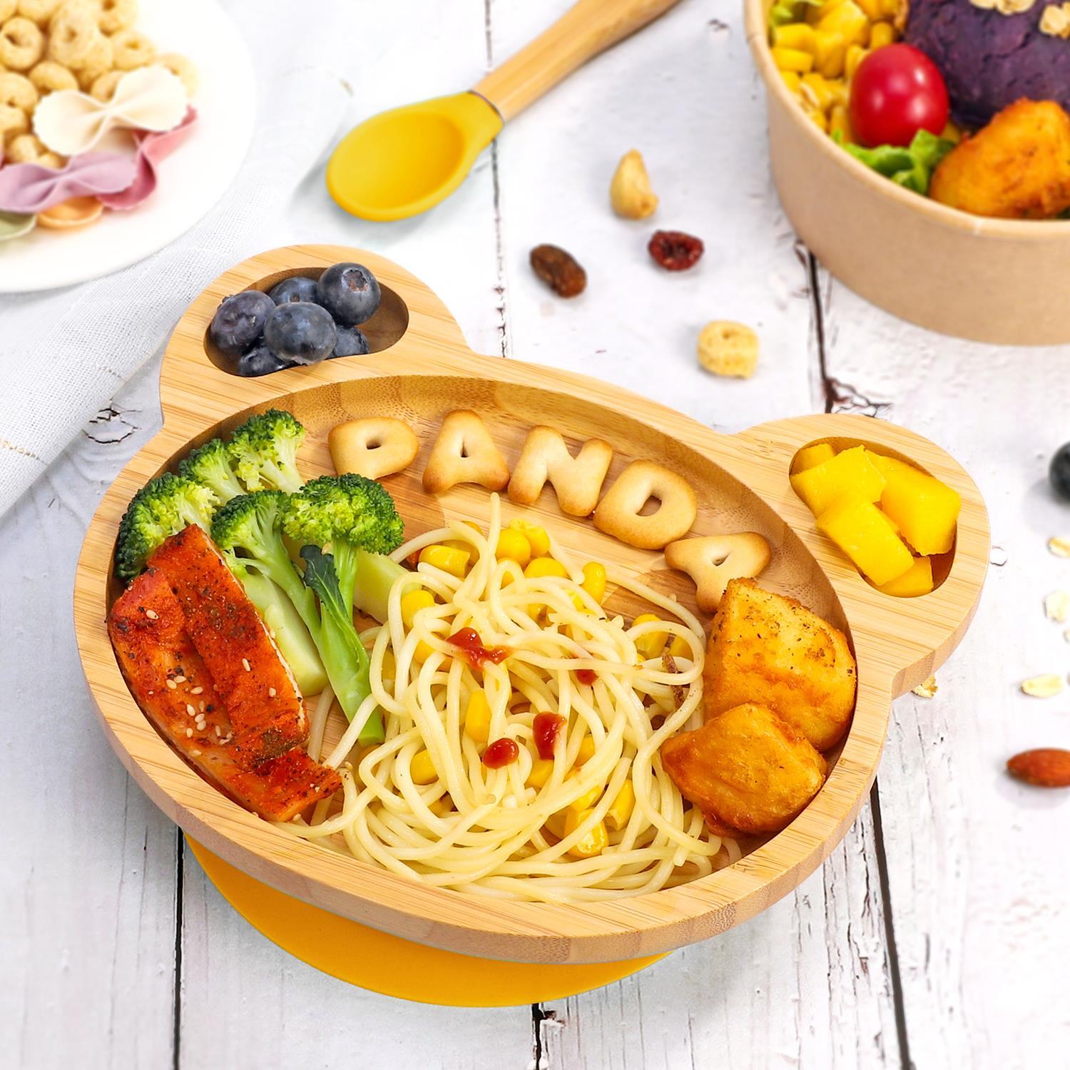 Bamboo Panda Plate Bowl & Spoon Set Suction Stay-Put Design (Yellow)