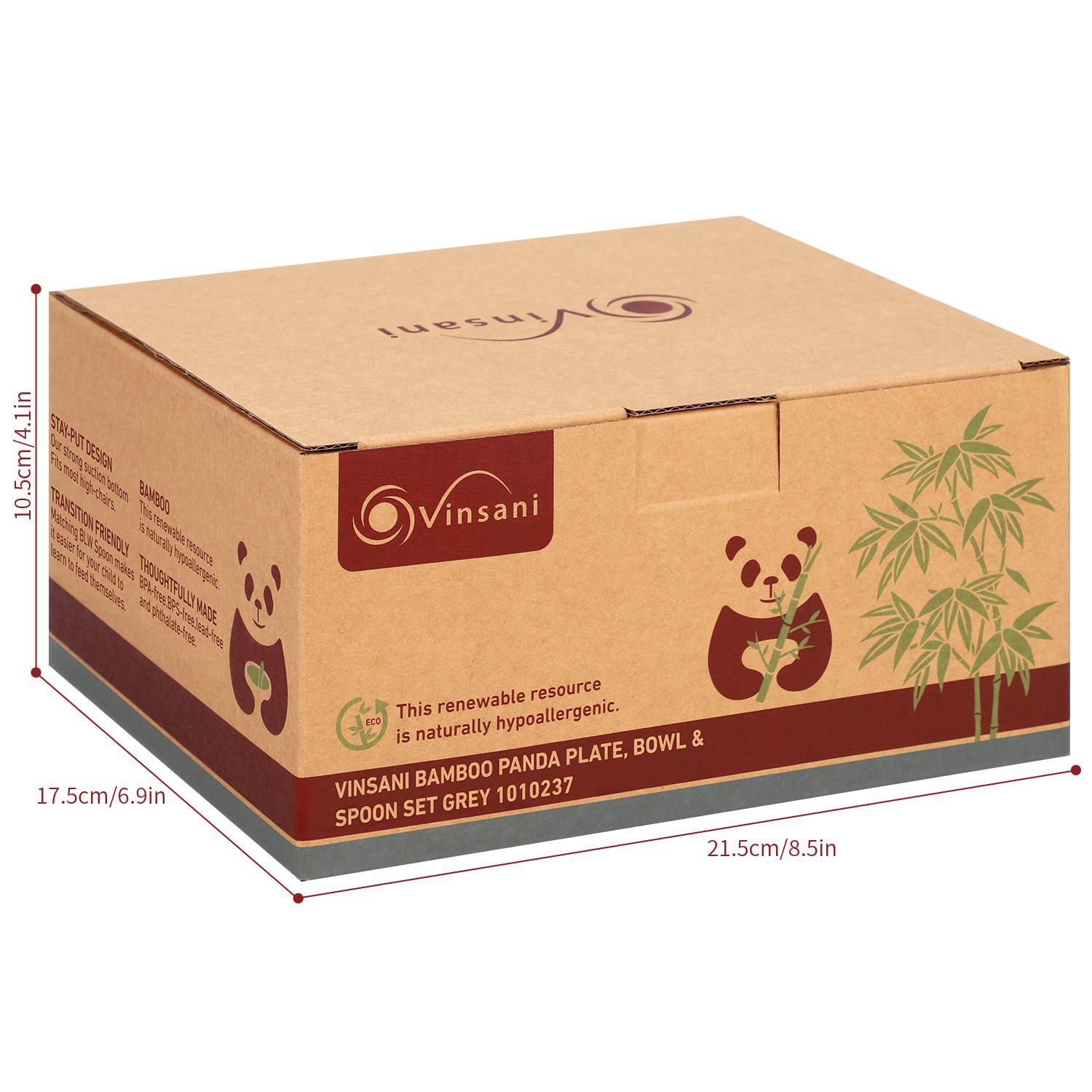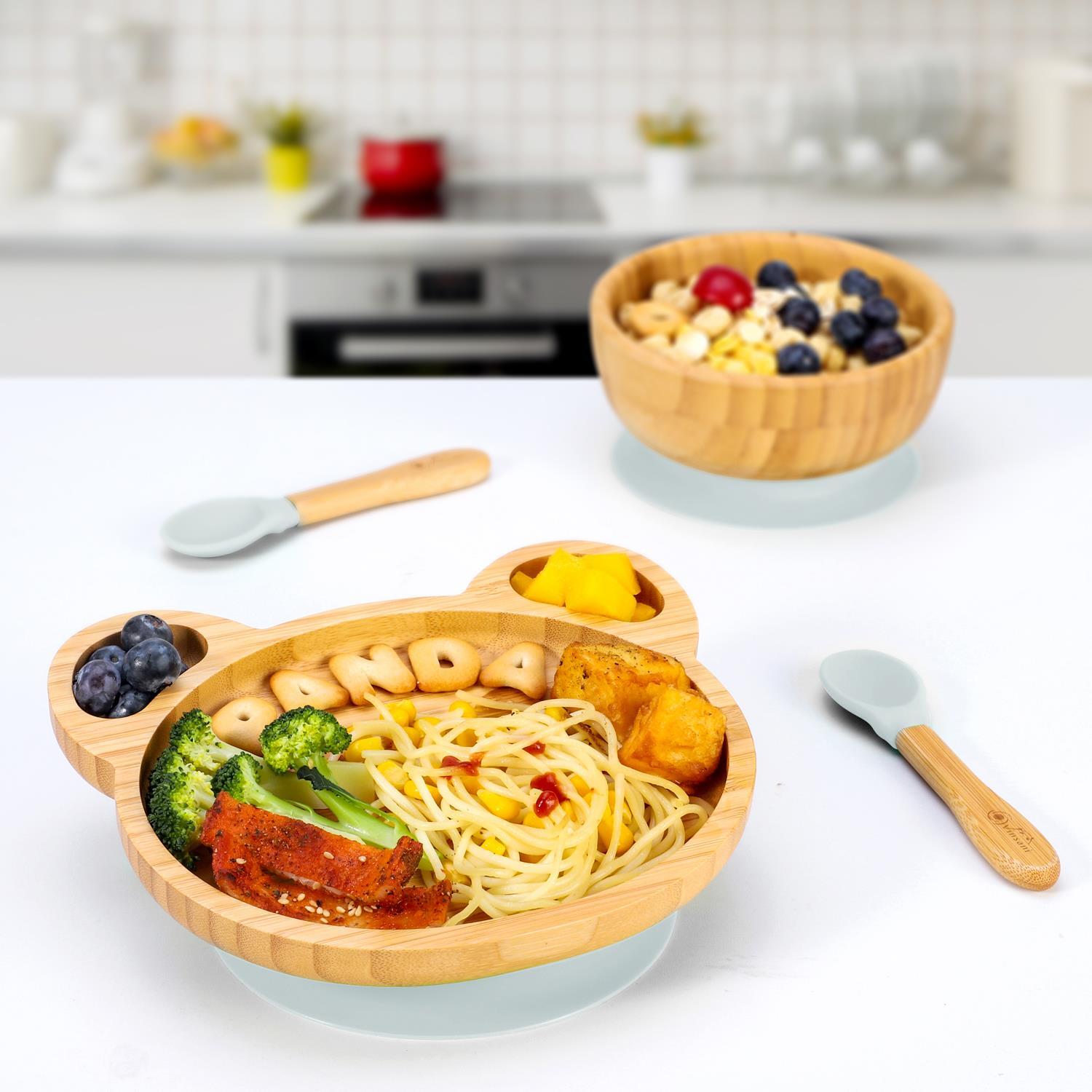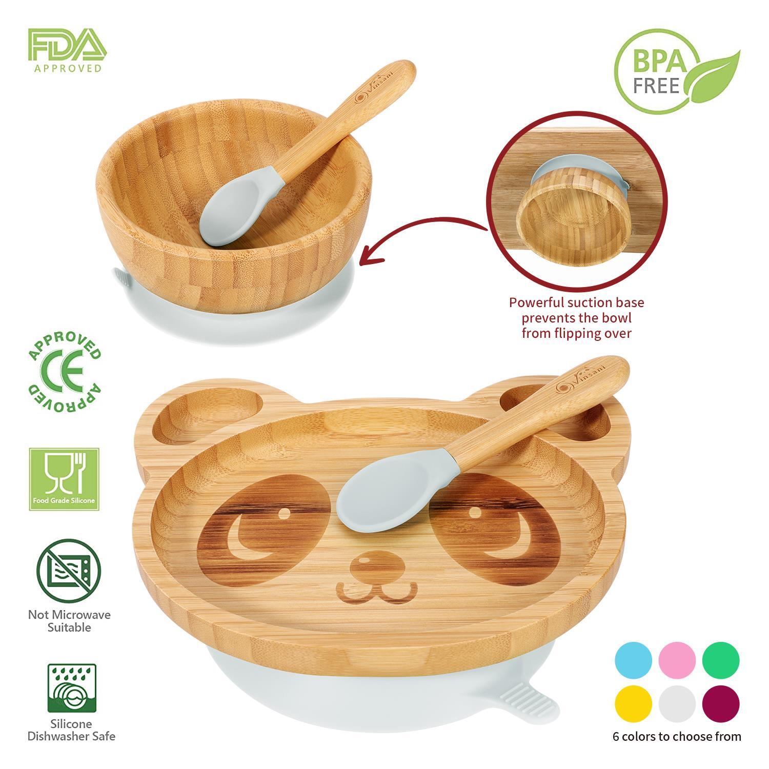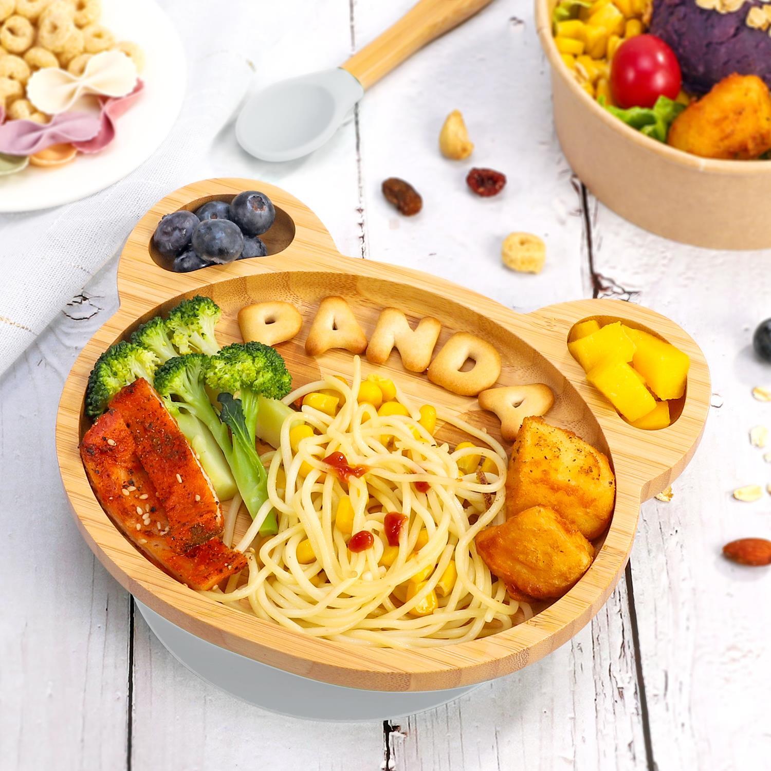 Bamboo Panda Plate Bowl & Spoon Set Suction Stay-Put Design (Grey)
