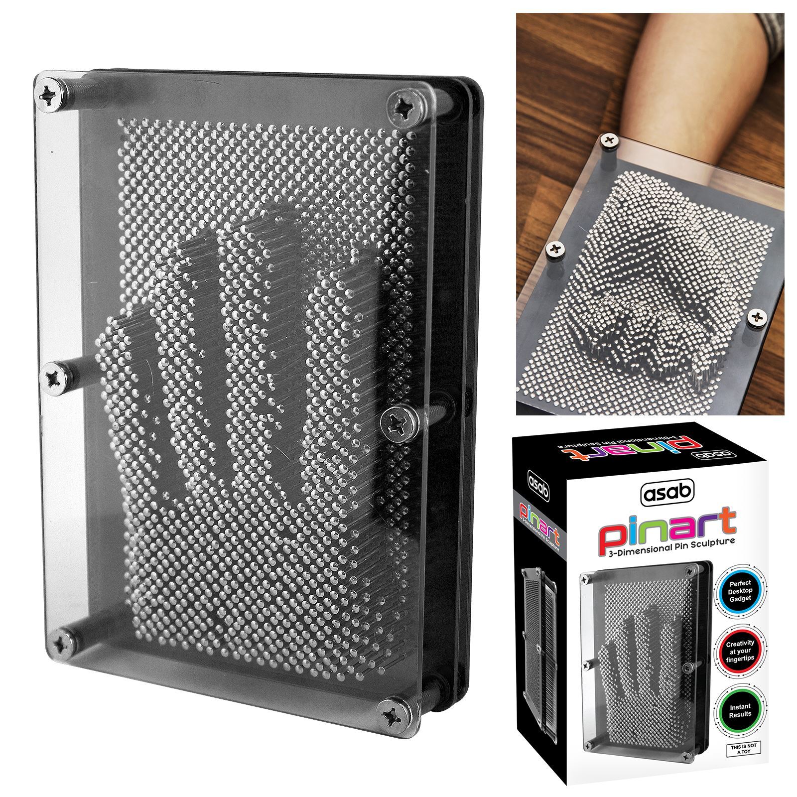This metal pin art frame is a classic desk toy which will never go out of fashion and is made up of hundreds of tiny shiny metal pins that when pushed will leave an impression of the object used . this col novelty gadget allows you to create countless patterns and sculptures just by pressing your hand, feet, face and many other objects that will leave cool patterns for you to display. 3D Metal pin art frame Classic impression art desk toy Hundreds of shiny metal pins Simply press objects into the pins Allows you to make countless patterns and sculptures Available in 4 colours (Black/Orange/Purple/Pink)Measurements Height: 18cm Width: 14cm Depth: 5cm Package Content 1 x 3D Metal Pin Art Frame
