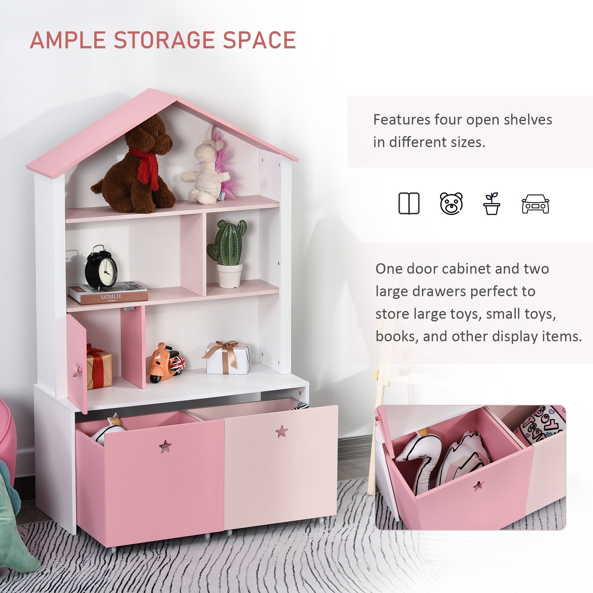 HOMCOM Kids Bookshelf Chest Drawer with Wheels Baby Toy Wood Organizer Pink