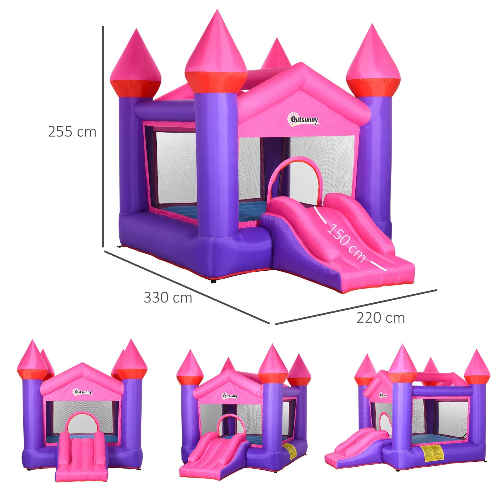 2 patches of each color in case of accidents. Made water-resistant oxford fabric with high density of 840D on jumping area and sliding area and it is big enough to accommodate 3 children at the same time.DIVERSE COMPOSITION: It consists of 1 trampoline and 1 slide which provide more fun for your kids. They could enjoy jumping, sliding, playing in this happy castle with their good friends.PERFECT GIFT: This will be a perfect gift for your kids because that it consumes their extra energy and replaces their screen time. Thanks to the feature of easy setting, it also ensures that you have more time to deal with your own affairs.DIMENSION: Overall dimension: 330L x 220W x 255H cm