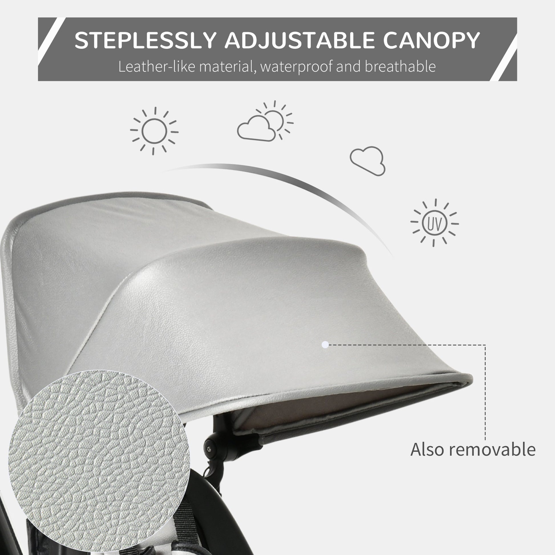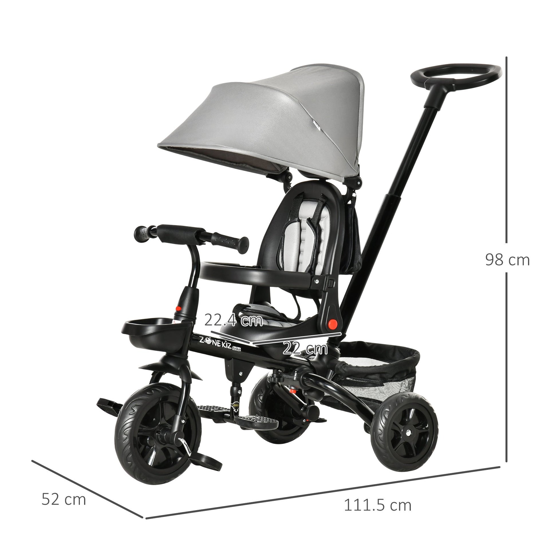 4-IN-1 MULTIFUNCTIONAL: This tricycle features a detachable parent push handle, canopy and guardrail. 4 forms can be switched freely, which suits your kid at different ages. It also comes with 2 storage baskets and 1 pocket to put supplies you need.FULLY ADJUSTABLE: The parent push handle used for steering is 3-gear adjustable to suit parents of different heights, also can be removed when not in use. The steplessly adjustable and removable canopy provides a shaded area and the foldable footrest provides extra comfort. The angle of the backrest is also adjustable to give your kids a most comfortable seating experience.STURDY & DURABLE: Constructed of solid metal, the tricycle is durable for long-lasting use. The seat and backrest covered with skin-friendly fabric are soft and comfortable(Non-detachable & washable).SAFETY FIRST: The tricycle equips a removable safety bar and 3-point safety belt, ensuring your kid is securely seated. Fully-closed wheels avoid unnecessary hurts. The front wheel has a clutch to lock the tire, and the rear wheel has a brake for easy parking. The seat is reversible for easy observation of your kids.EASY ASSEMBLY & STORAGE: This three-wheeled cart adopts a quick and easy disassembly design, so that anyone can easily handle it without any tool. The U-shaped tube at the rear of the car can be folded inward to make storage more convenient. Overall dimension: 111.5L x 52W x 98H cm. For kids 1-5 years old, within 25kg.