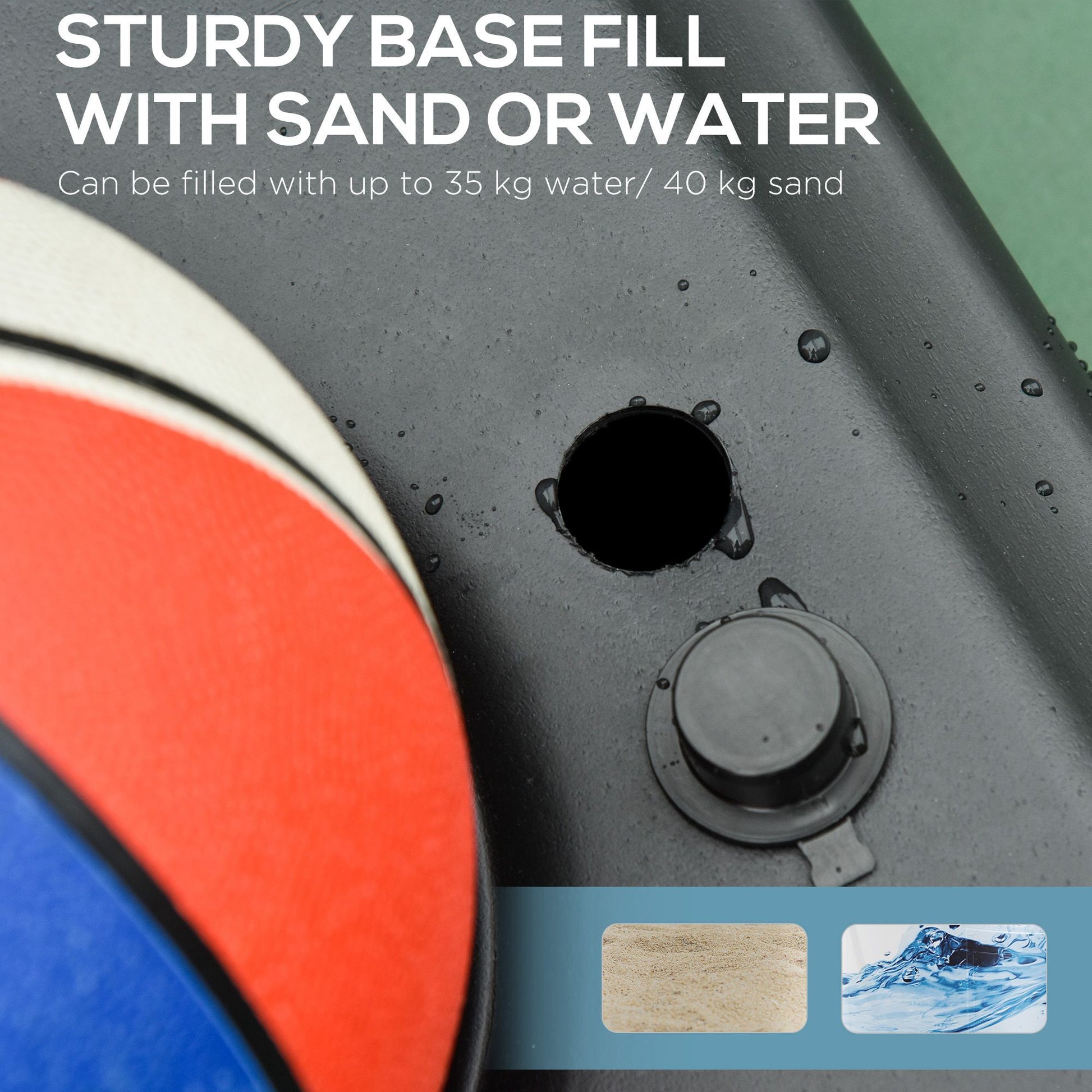 Enjoy shooting hoops with this HOMCOM basketball stand. With an adjustable height, it's suitable for all ages �C everyone can join the fun. A steel frame for strength and durability, whilst the base can be filled with water or sand, keeping it firmly in place. Wheels at the bottom lets you move the stand with ease, so you can position it properly. Play on your own or with friends and family