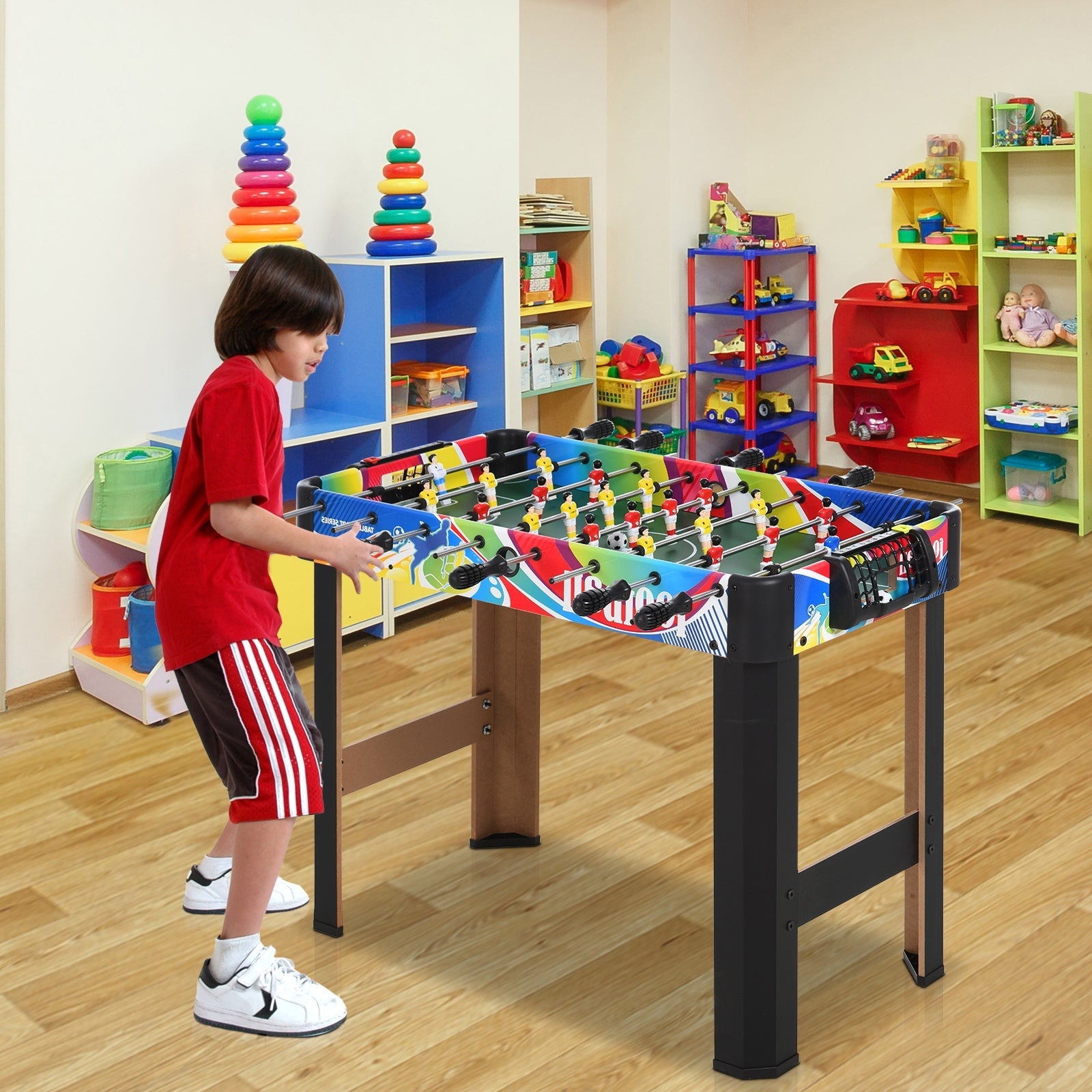 Gather your friends up for some friendly competition with this football table from HOMCOM. It comes in a full sized model, featuring ten players per team with one goalie each. A 3-4-3 formation spread over four poles on each team, the miniature players are attached on stainless steel rods which move around a full 360, with soft grips on the ends for comfort whilst in action. The structure is crafted from MDF for complete stability whilst in use, finished in a multicoloured design for a fun look. It's finished with a scoreboard on both sides to keep tracks of who's winning. A classic pub game you can play in your own home.