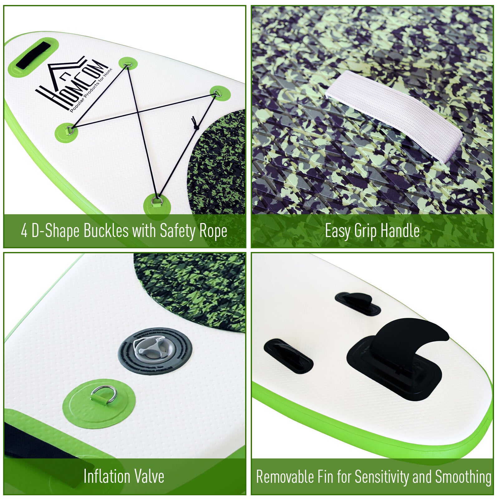 Bring fun and adventure to your beach days with this inflatable paddleboard from HOMCOM. Large in size and tough in usage. the shell is strength and durability, with its 302cm x 72cm size making it ideal for use by both adults and children. On the top, a non-slip EVA panel is placed so you can safely stand firmly, with a back fin for smoother surfing and a ��D�� shaped buckle and rope, allowing you to secure your belongings to the board. An easy and fun way to explore the water on your holidays.