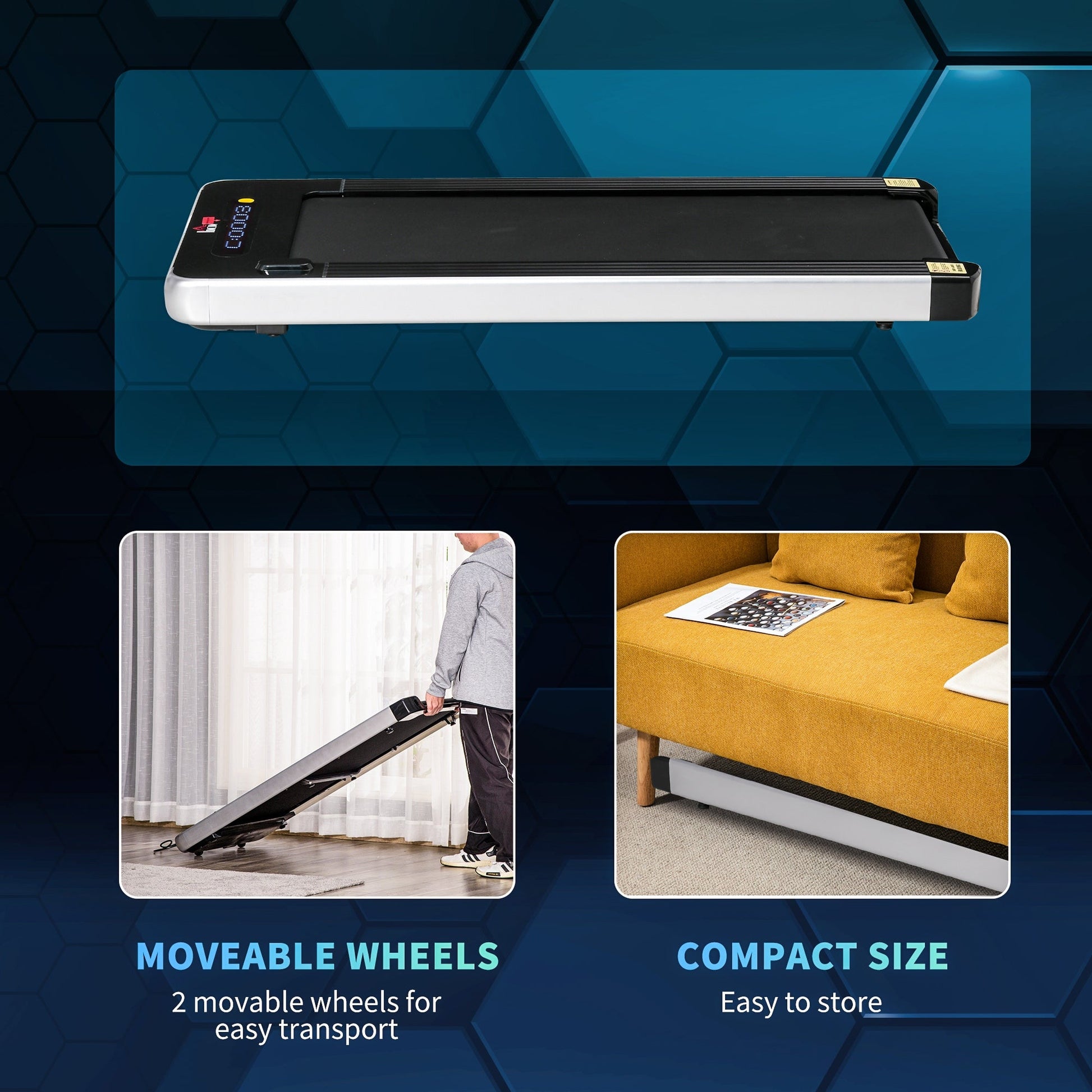 Reach personal fitness goals with this HOMCOM walking treadmill, which has an LED monitor, so you can keep track of time, calories, distance and speed. This can all be done comfortably at home, thanks to its compact size and attached wheels, letting you move it freely around the house. Exercise at your own pace by adjusting the speed between 1-6km/h. A great way to keep active from the comfort of your living room.