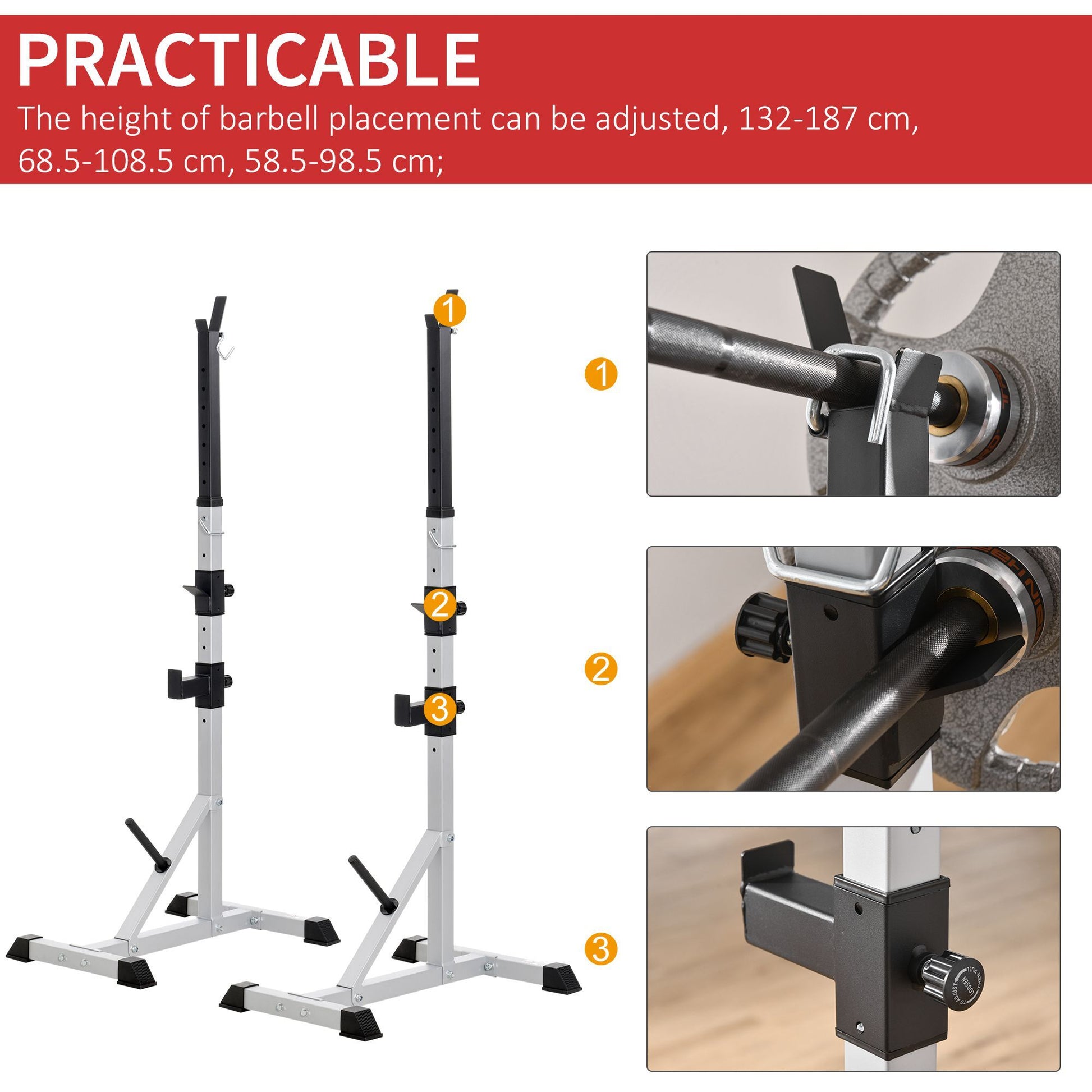 Bring gym workouts to your own home with this barbell rack from HOMCOM. Formed heavy-duty steel, the frames are tough and sturdy for long-lasting use, able to hold up to 200kg with ease. They can be set to different levels with a 'J' shaped bracket on the top for extra room. Both racks are finished with 'H' shaped bases to ensure stability, with rubber caps on all sharp edges for safety. An excellent way to work on squats, bench presses, lunges, deadlifts and more during any time of the day.