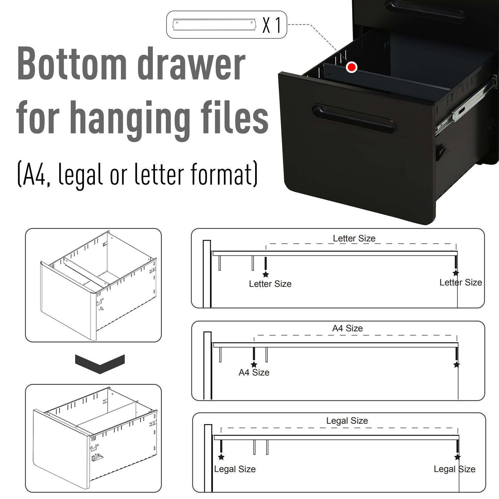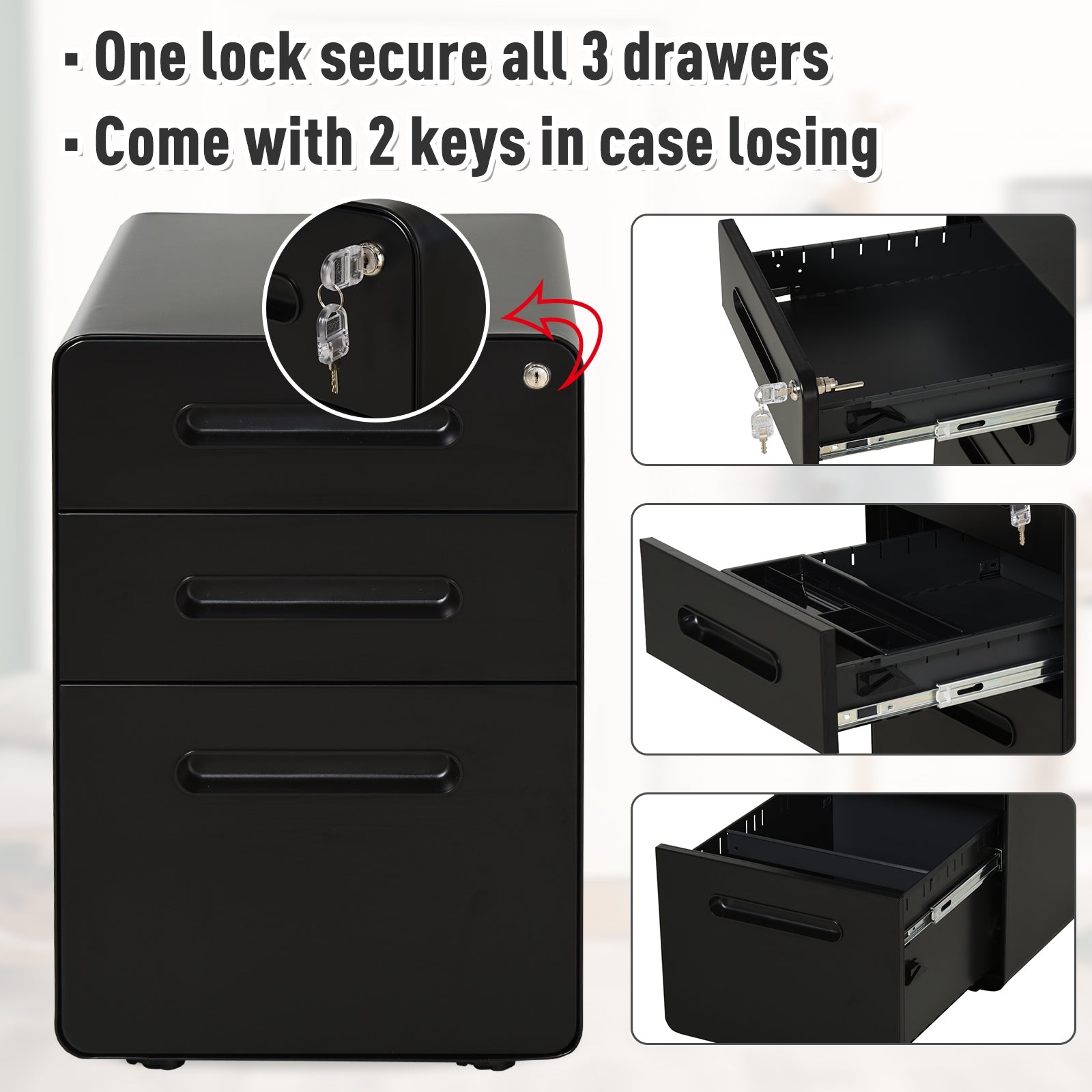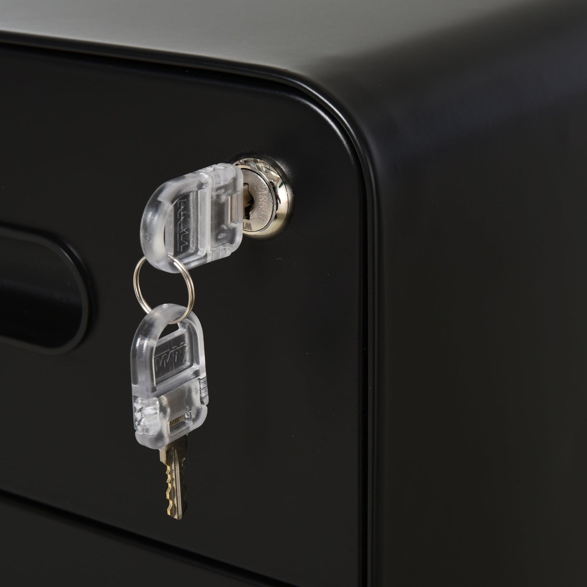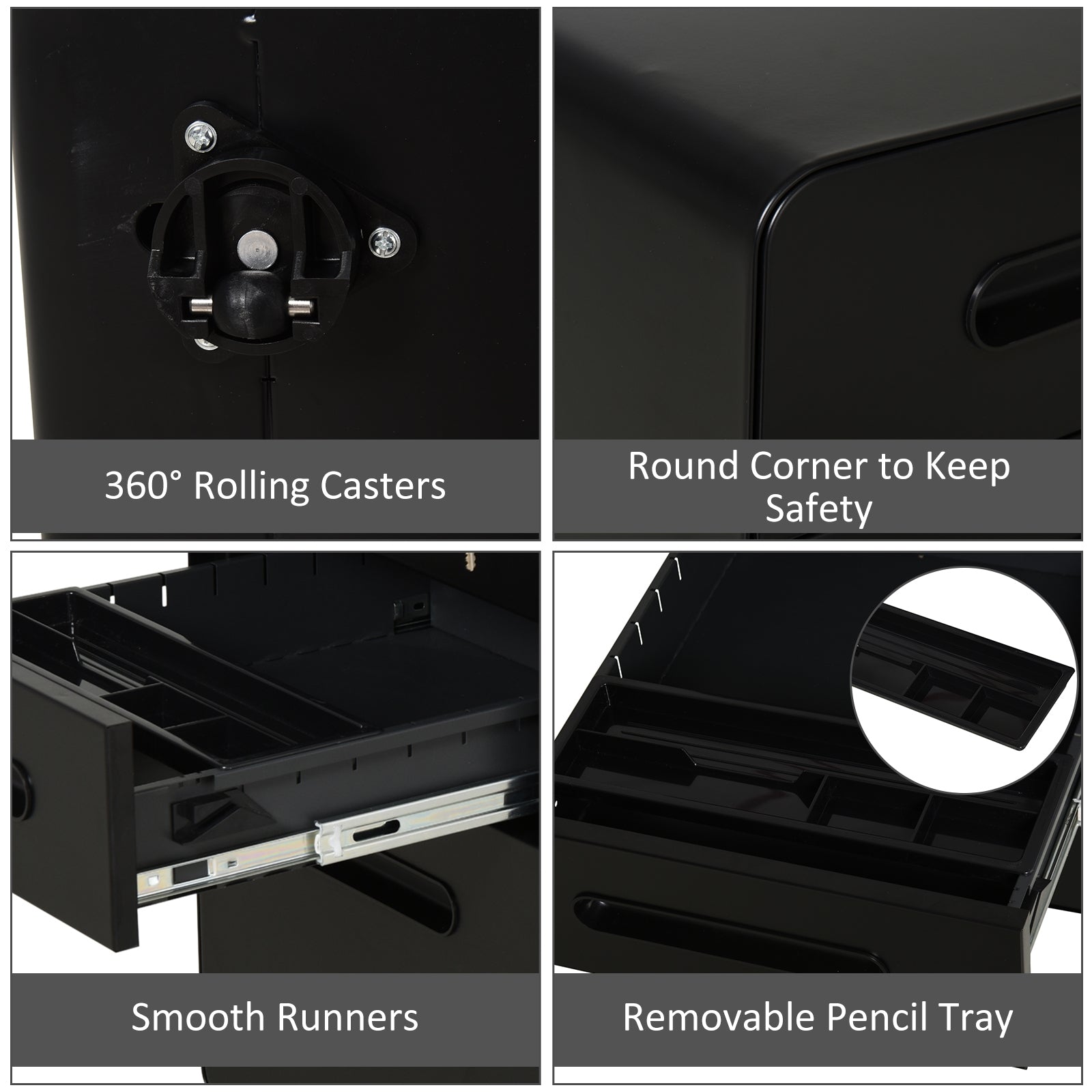 3 Draw Modern Steel Filing Cabinet w/ 4 Wheels Lock Pencil Box Black Vinsetto