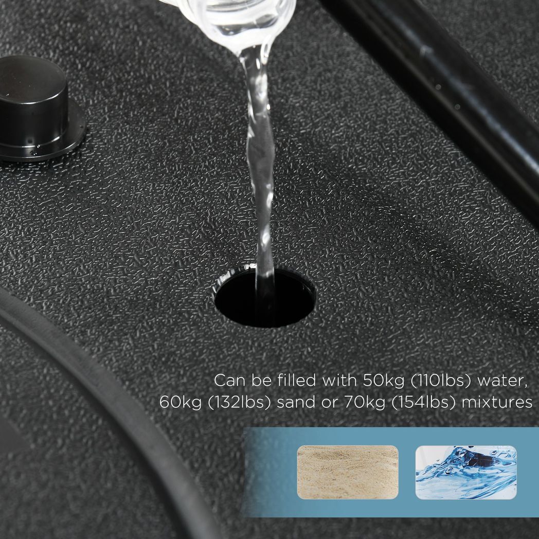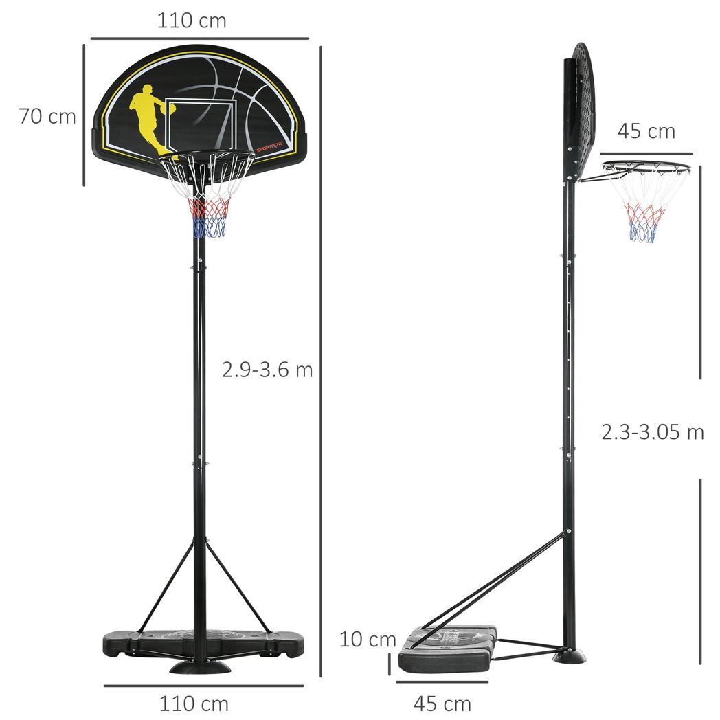 5-Level Height Adjustable: Easy adjustment mechanism allows you to conveniently adjust the basketball stand from 290 to 360cm. Perfect for outdoor recreation and fun, matching different players' sizes.Stable Base: The basketball stand's base can be filled with either sand or water to keep it firmly placed on the ground. The base weight is 50kg when filled with water, 60kg with sand, or 70kg when filled with sand and water.Free Moving: Built-in roller wheels allow you to easily move this basketball hoop around, which can be done by one person.All-Weather Construction: Solid steel triangular frame plus a high-strength PE backboard for basketball hoop optimum support to keep up with your intense basketball game. Included a durable, thickened basketball net.Backboard Dimension: 110W x 70H x 3D cm, Overall Height: 290-360cm, Basketball Hoop Height: 230-305cm, Base Dimension: 110L x 45W cm. Assembly required.