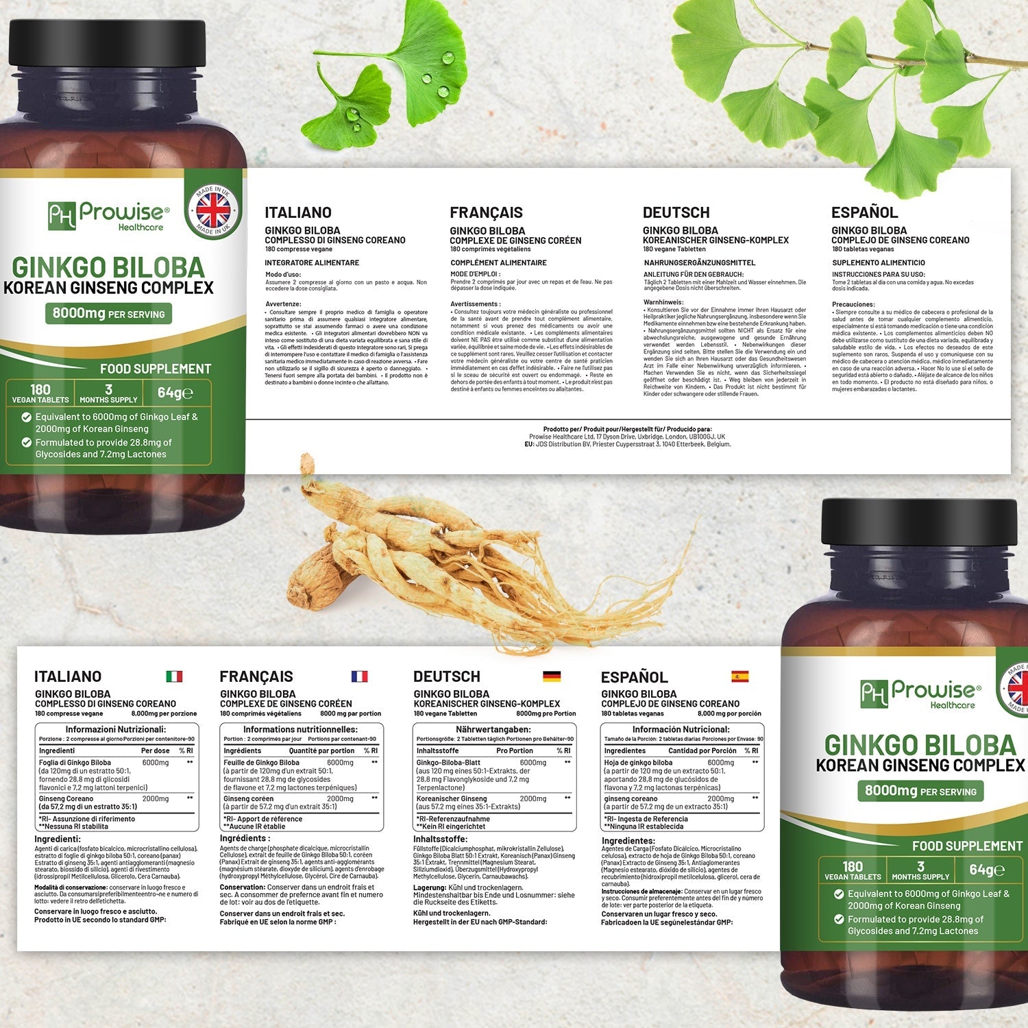 Ginkgo Biloba and Korean Ginseng Tablets 8000mg 180 Vegan Tablets by Prowise