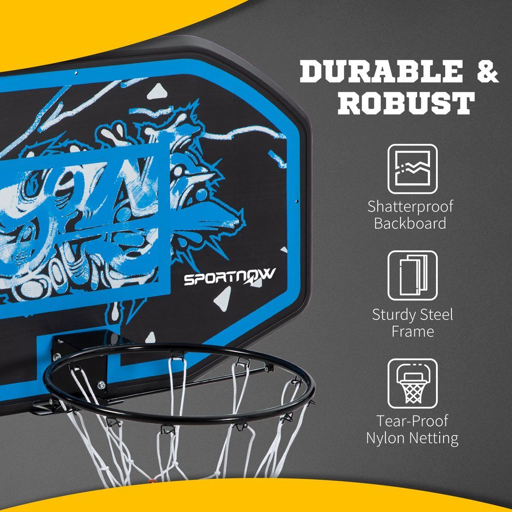 Versatile basket ball hoop: Designed to be mounted on a door, wall, eave or pole, using a universal bracket. Create your own sports zone, whether it's indoors or outdoors.Sporty appearance: This door basketball hoop has a square box in the centre of the backboard, which helps with your target. Designed with graffiti-like patterns, bringing a stylish look.Solid material: Steel frame is covered in powder-coated finish for durability, whilst the thick and rigid backboard is shatter-resistant. The basketball net is weather-resistant, making it suitable for outdoors.Dimensions: 61H x 109L x 71Wcm. Backboard: 109L x 71W x 3.5Dcm.Easy assembly required.