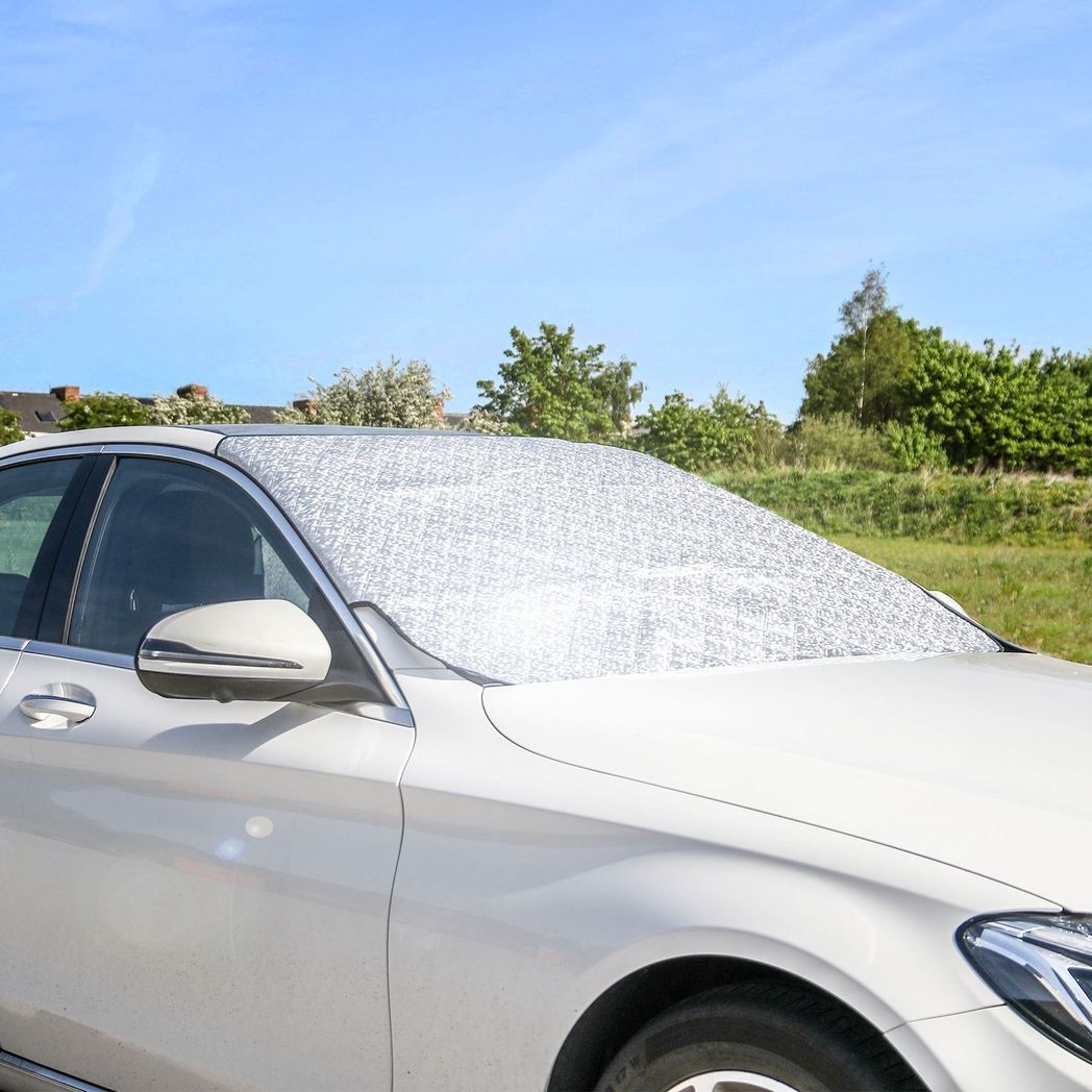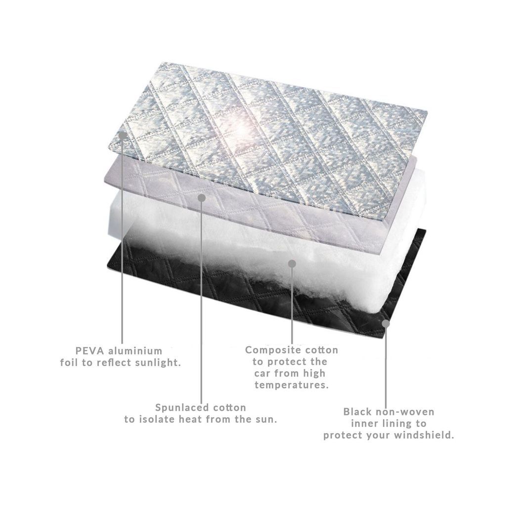 Aluminium foil surface layer and high-quality flame retardant cotton inside of this cover will keep your car front window protected from sun UV rays in summer and leaves in autumn. This car windscreen cover will soak up the UV rays so your car doesn�t have to. Being made from aluminium foil, this also means the cover is durable and tear-resistant!