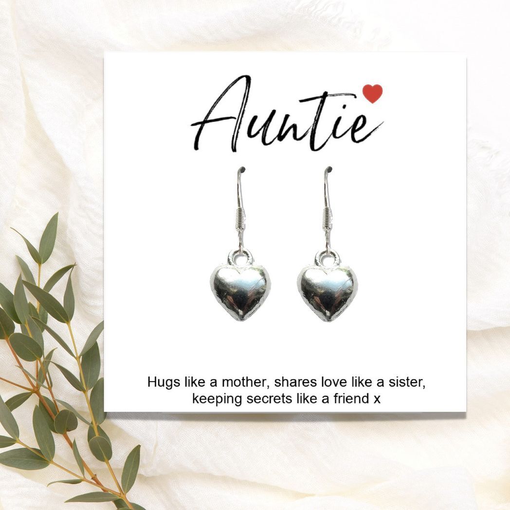 Pretty heart earrings presented on a little message card with the words "Auntie - Hugs like a mother, share loves like a sister., keeps secrets like a friend" with a small space for you write a little note or it can also be left blank the choice is yours. It is sent in a black gift box for her birthday, Christmas, or a little thank you gift. Earring - Sterling Silver Plated Puff Heart Charm - 11.5 x 9 x 4.5mm Tibetan silver finish Delivered on a message card & in a black gift box Letter box friendly gift - fits through a standard size letter box Delivered on a message card & in a black gift box Letter box friendly gift - fits through a standard size letter box.