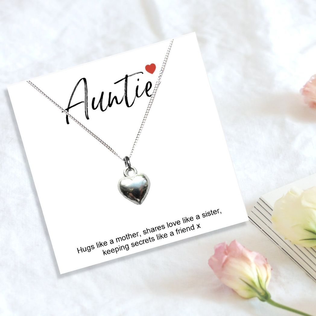 Pretty heart necklace presented on a little message card with the words "Auntie - Hugs like a mother, share loves like a sister., keeps secrets like a friend" with a small space for you write a little note or it can also be left blank the choice is yours. It is sent in a black gift box for for her birthday, Christmas, or a little thank you gift. Chain Length: 16 inches (40.5cm) or 18 inches (46cm) Sterling Silver Puff Heart Charm - 11.5 x 9 x 4.5mm Tibetan silver finish Delivered on a message card & in a black gift box Letter box friendly gift - fits through a standard size letter box Letter box friendly gift - it fits through a standard size letter box
