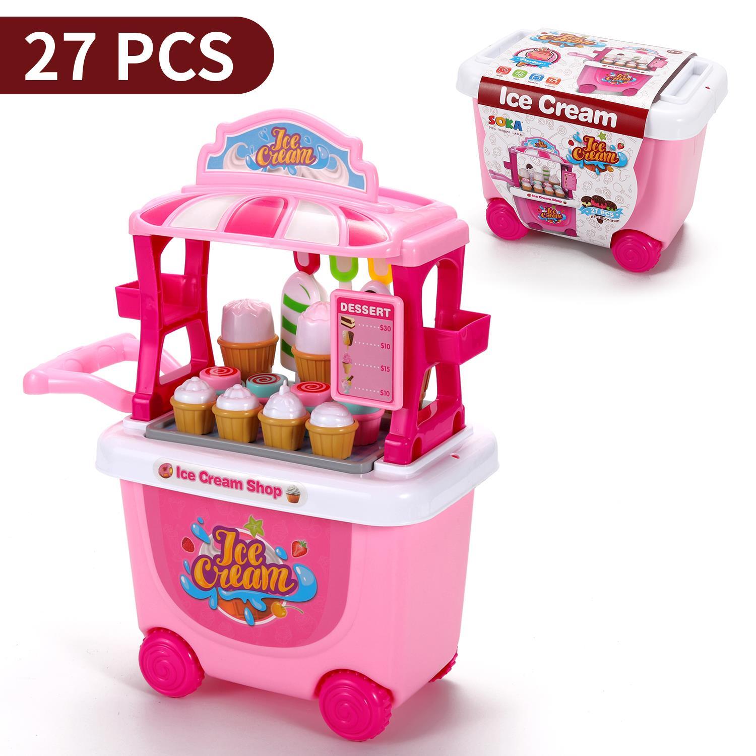 SOKA 27 pcs Ice Cream Trolley Shop Cart Toy for Children Pretend Play Food