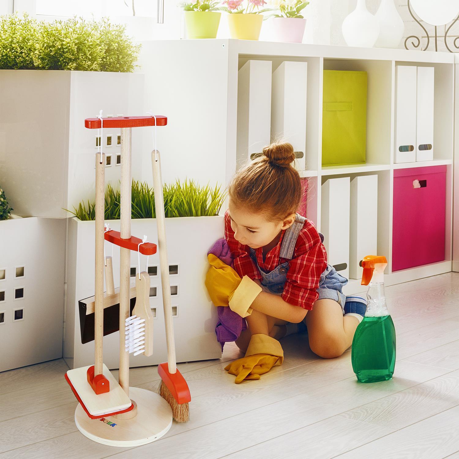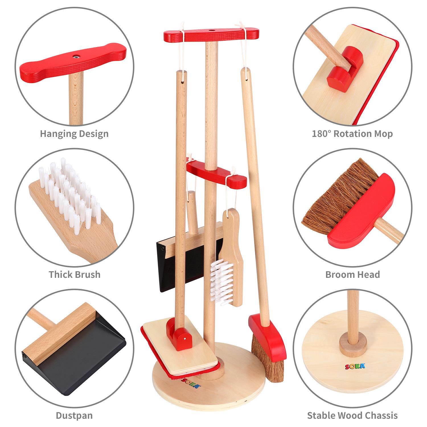 REALISTIC TOY: Lelin Cleaning Kit is a colourful, kid-sized cleaning kit that looks just like real cleaning tools. The set includes wooden pretend play broom, mop, dustpan, brush and an organising stand.