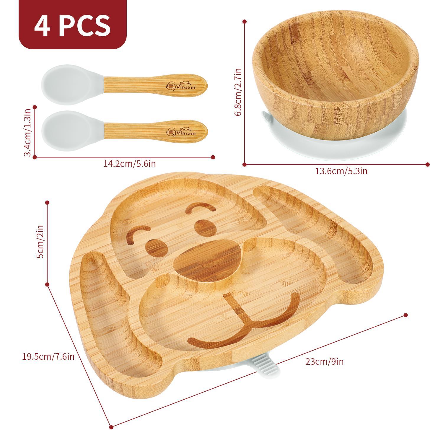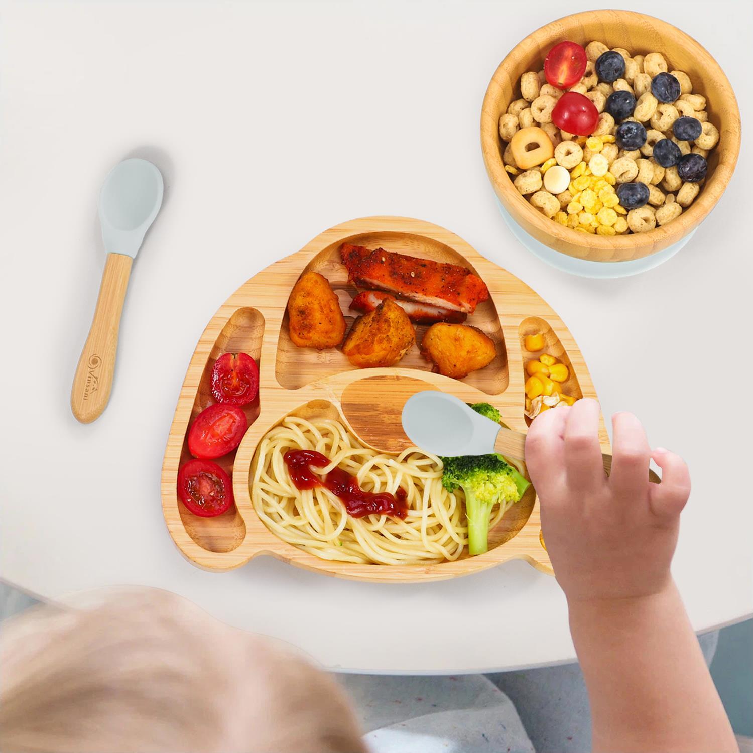 4-SECTIONED PLATE: Comes with a set of a plate, bowl, and 2 spoons. The 4 sectioned plate is convenient for serving various food groups and encouraging weaning. They are fantastic for assisting parents in preparing balanced meals.