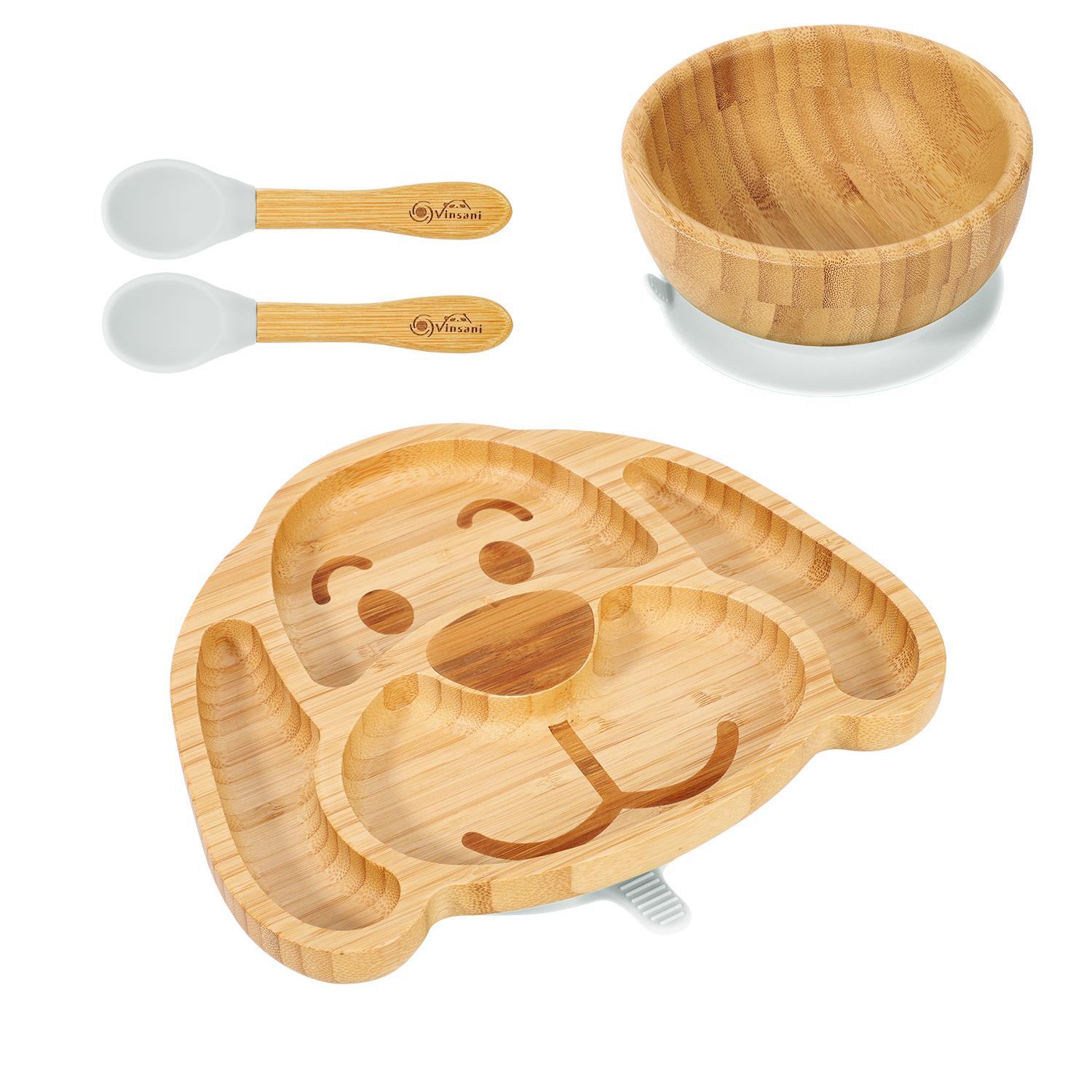 Bamboo Dog Plate Bowl & Spoon Set Suction Bowl Stay-Put Design - GREY