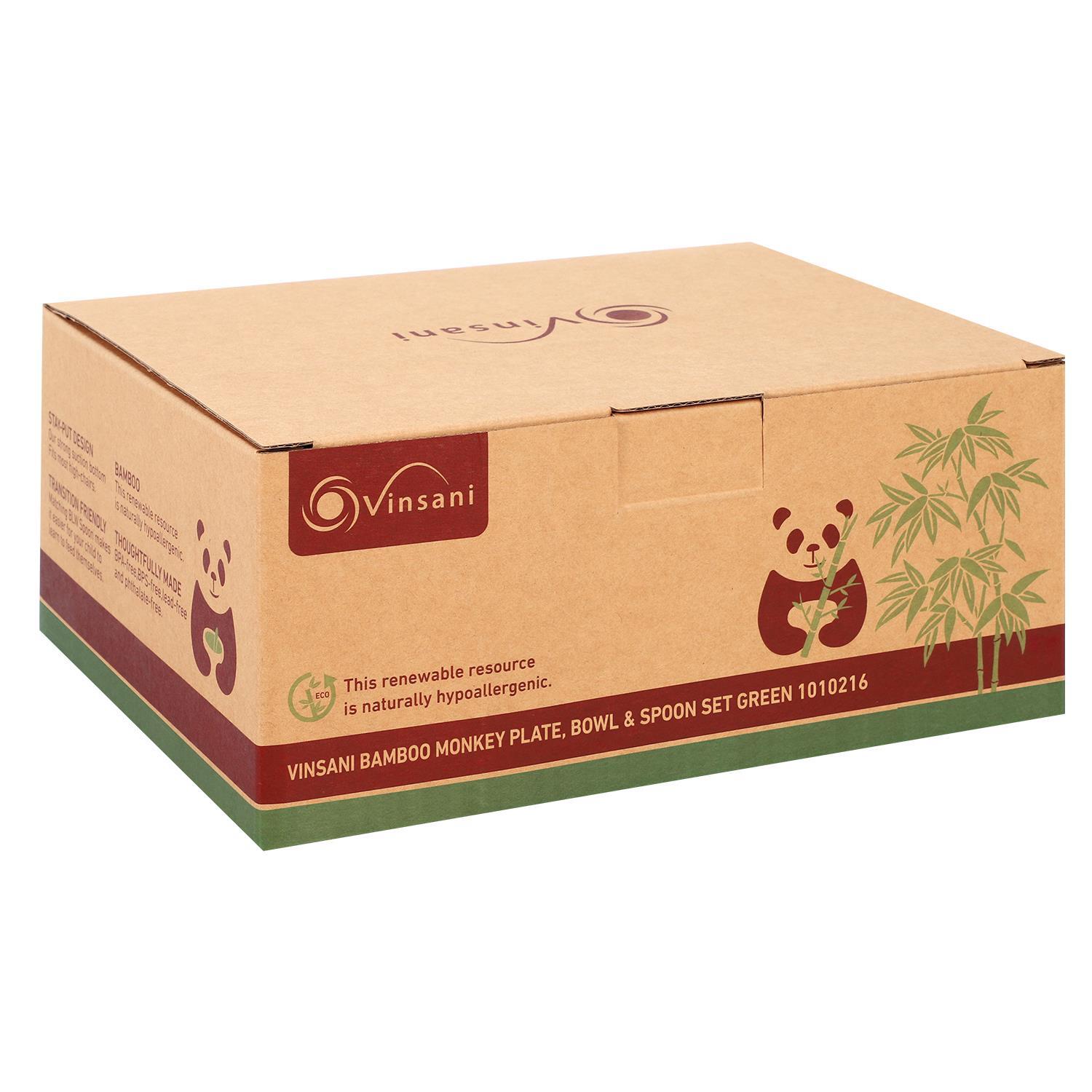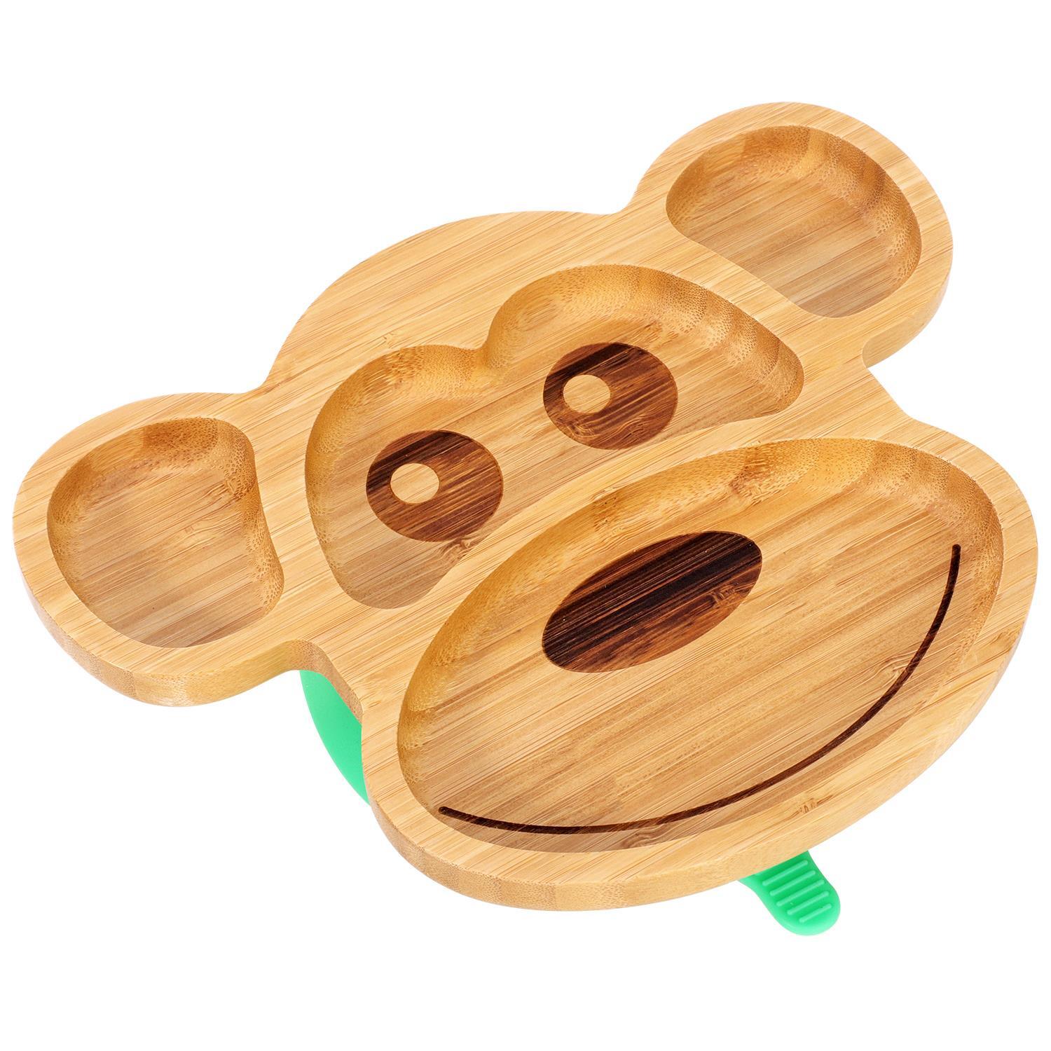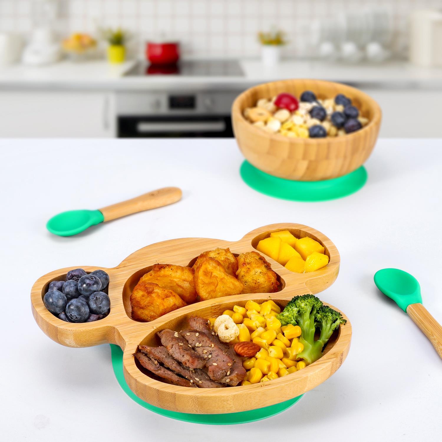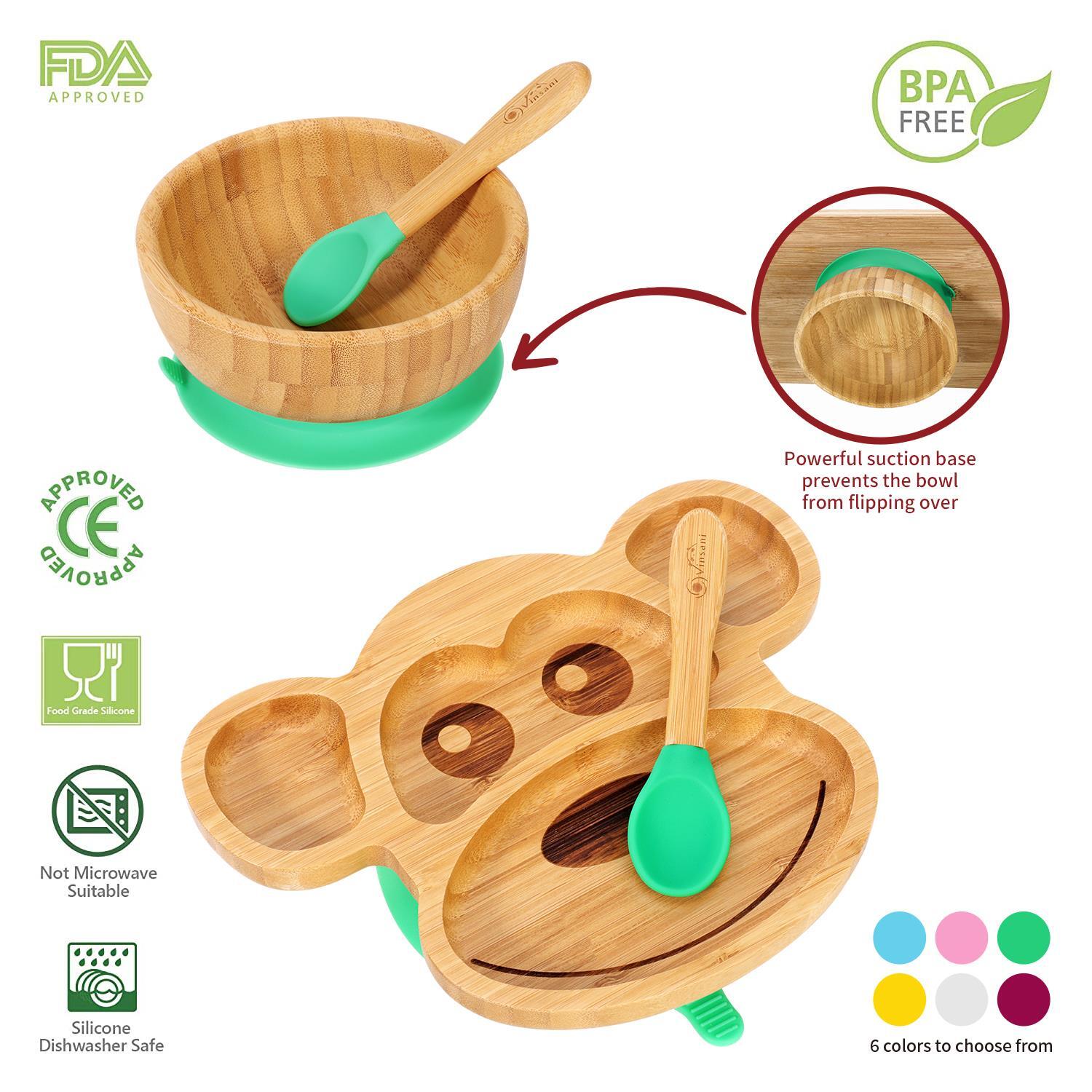 Bamboo Monkey Plate Bowl & Spoon Set Suction Bowls Stay-Put Design - GREEN