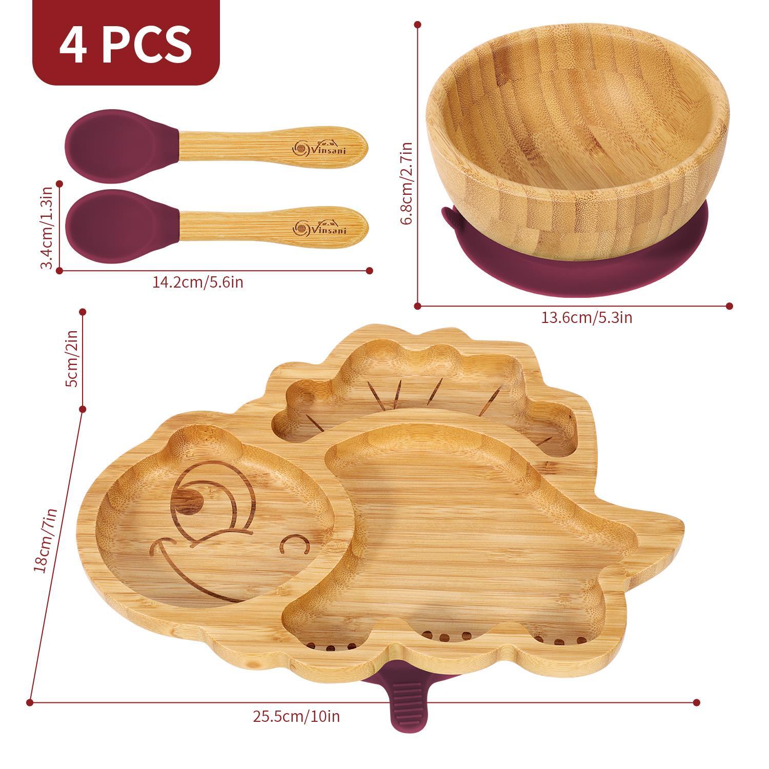 DIMENSIONS: Our bamboo suction plates fit most highchairs. Measurements: Plate: 18 x 25.5 x H 5 cm (7 x 10 x 2 in) Bowl: 13.6 x 6.8 (5.3 x 2.7in) cm Spoon: 14.2 x 3.4cm (5.6 x 1.3 in)