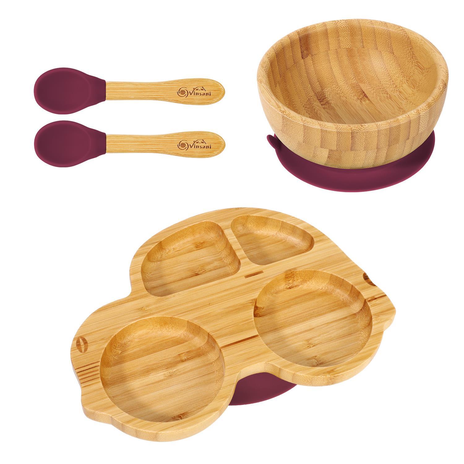 Bamboo Car Plate Bowl & Spoon Set Suction Bowl Stay-Put Design for Kids - RED