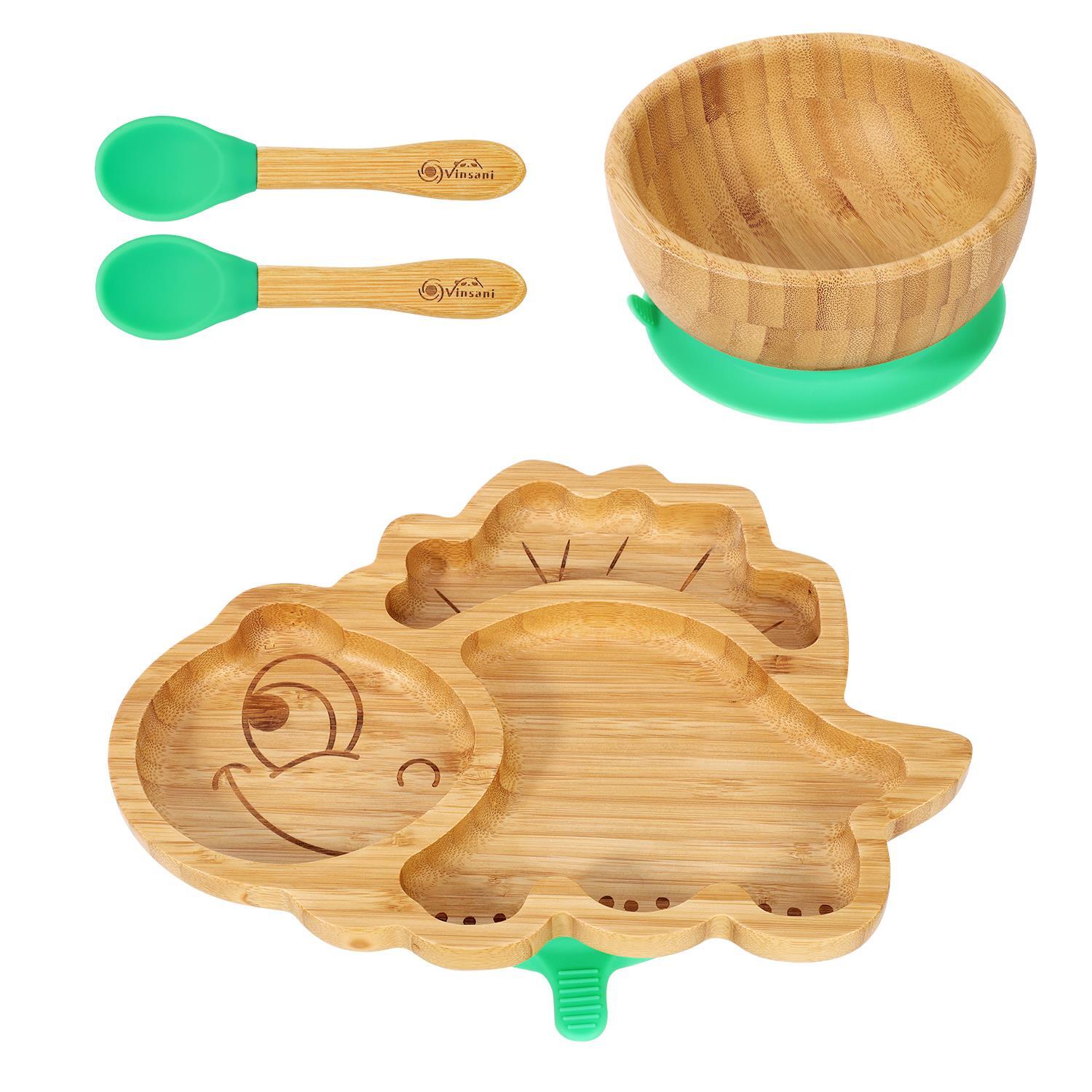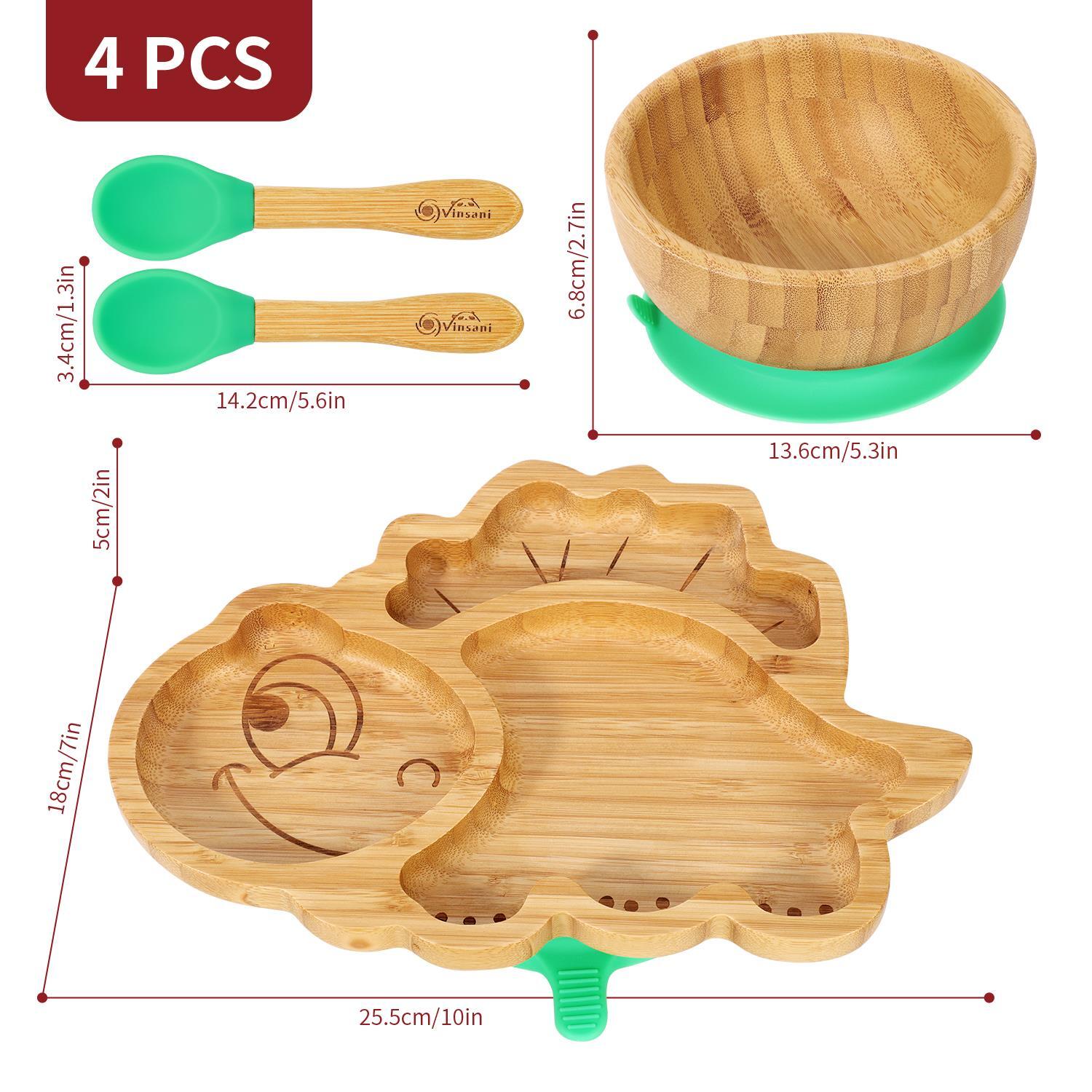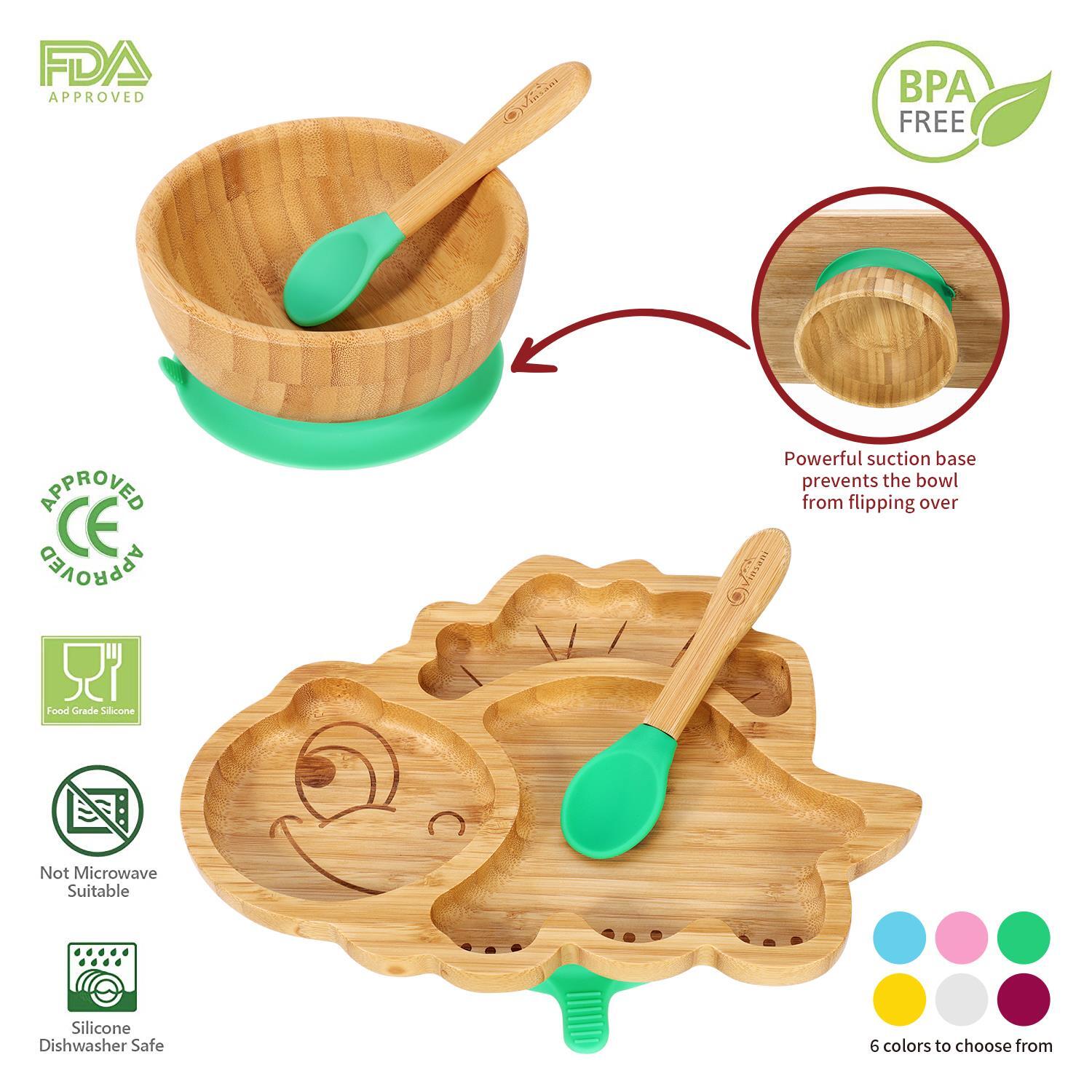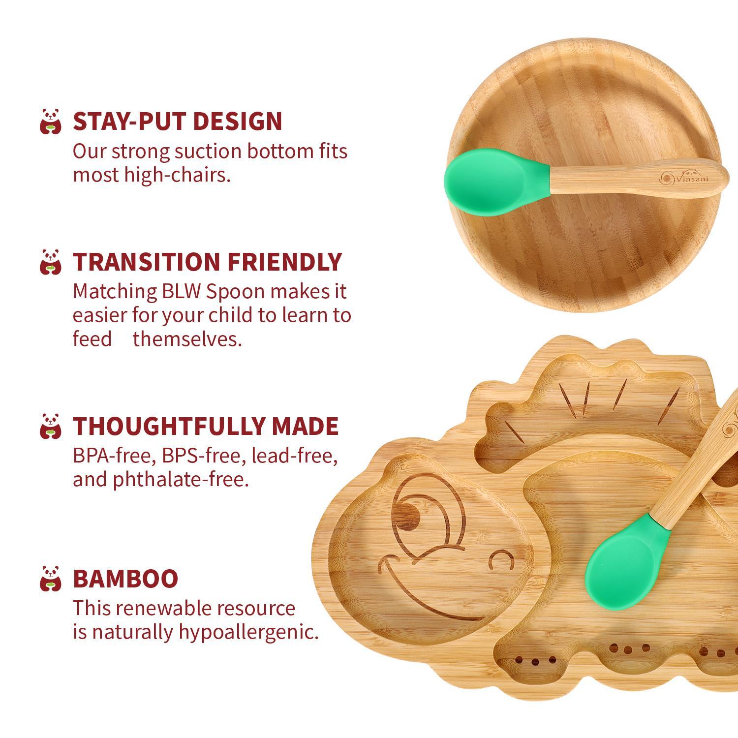 Bamboo Dinosaur Plate Bowl & Spoon Set Suction Bowl Stay-Put Design - GREEN