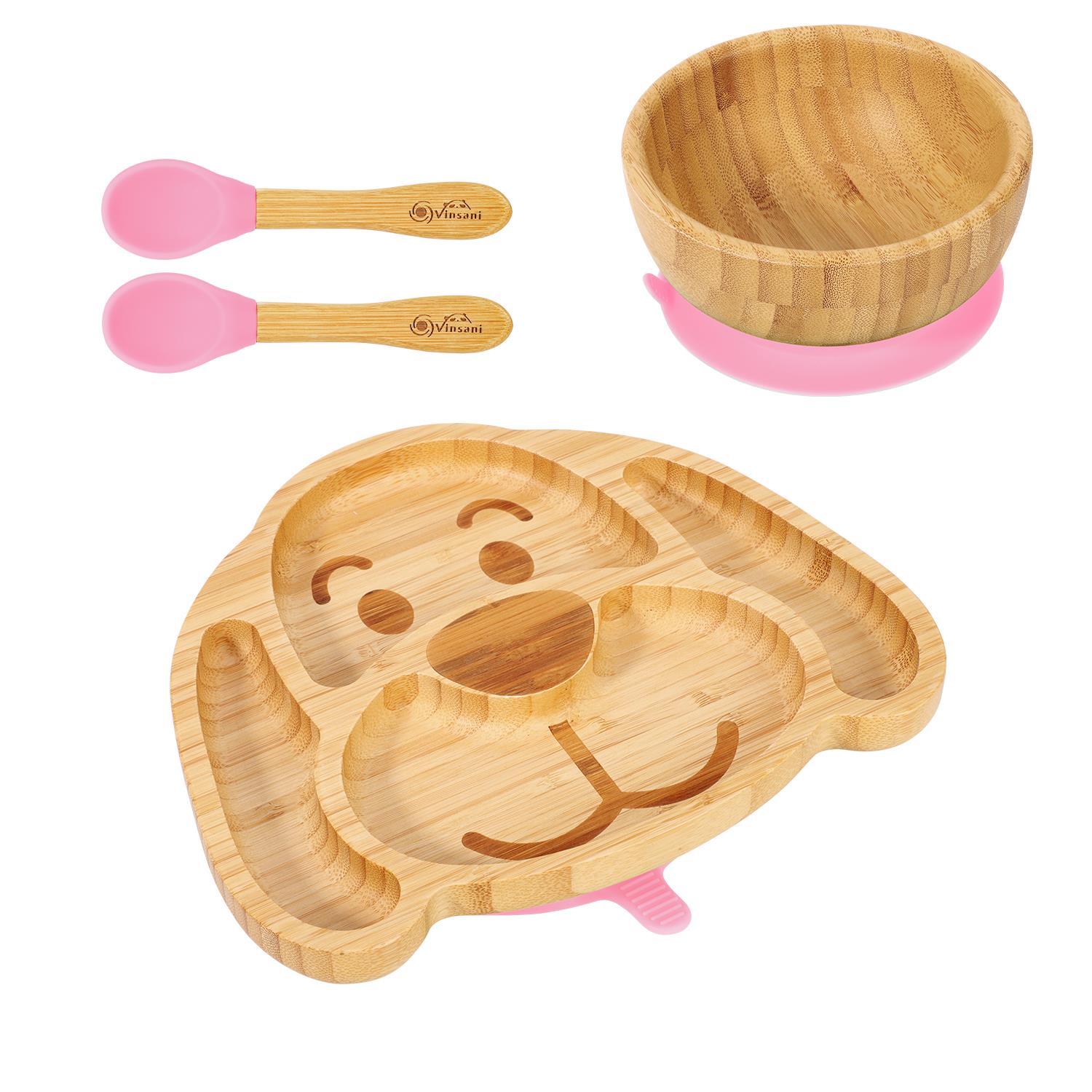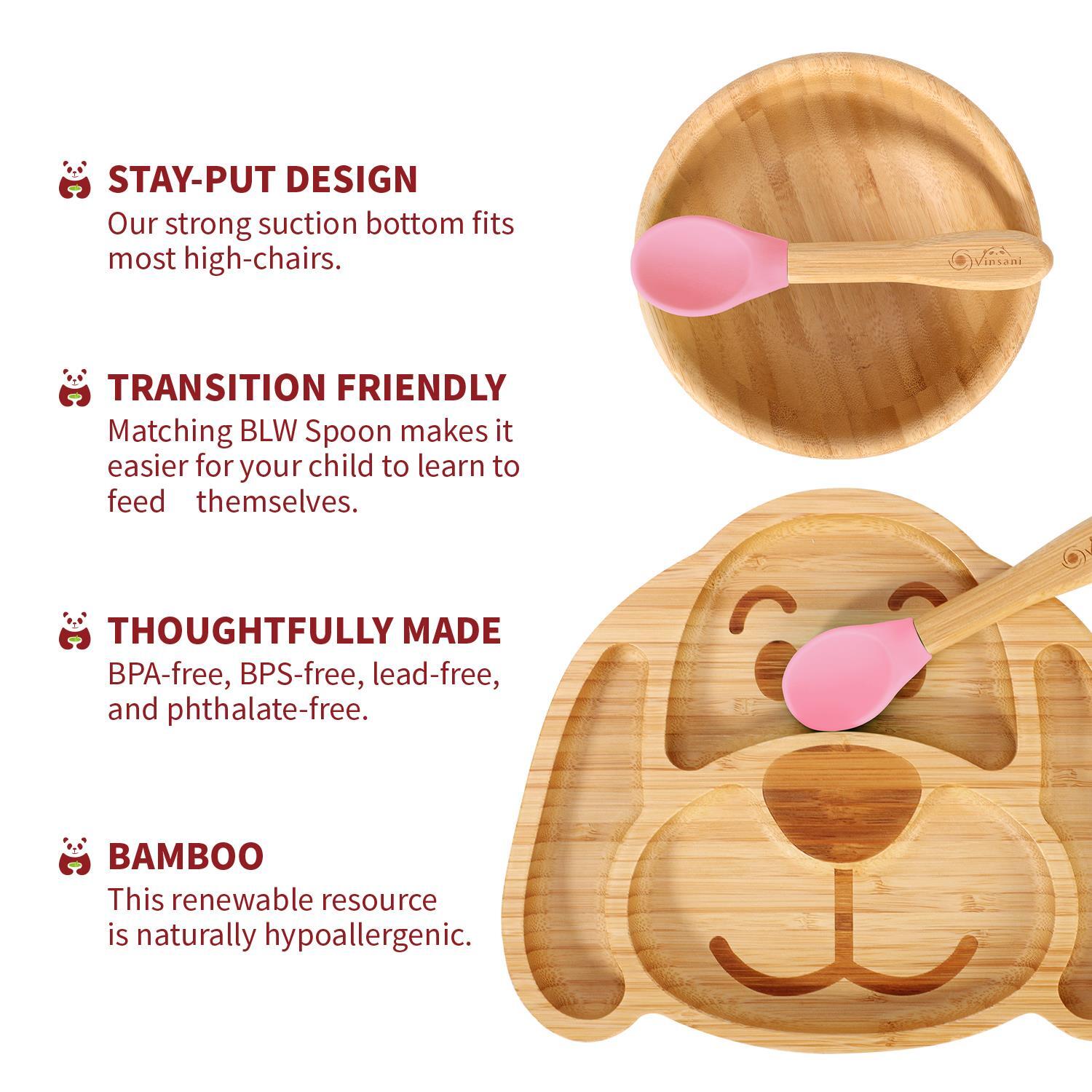 Bamboo Dog Plate Bowl & Spoon Set Suction Bowl Stay-Put Design - PINK