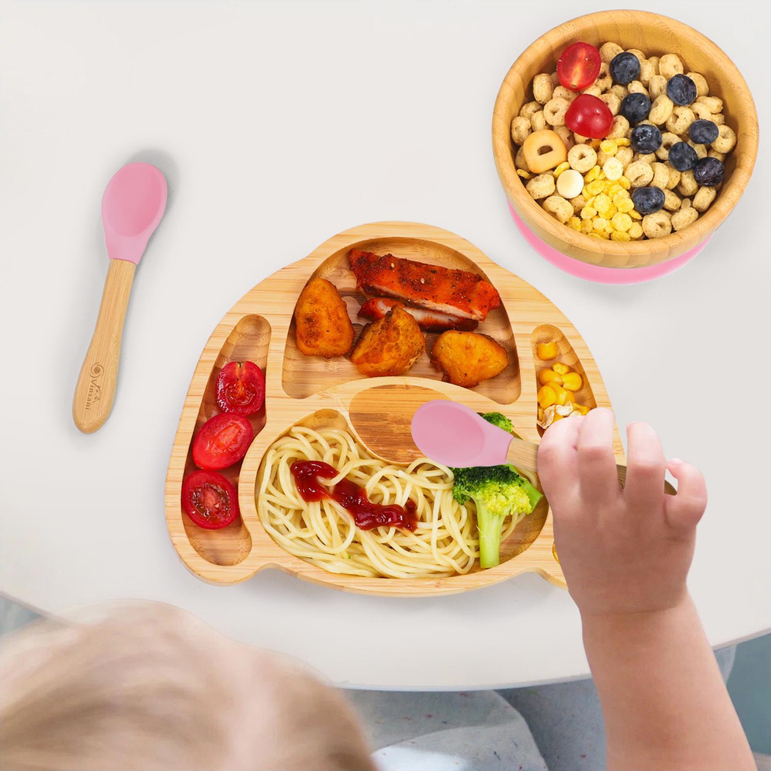4-SECTIONED PLATE: Comes with a set of a plate, bowl, and 2 spoons. The 4 sectioned plate is convenient for serving various food groups and encouraging weaning. They are fantastic for assisting parents in preparing balanced meals.