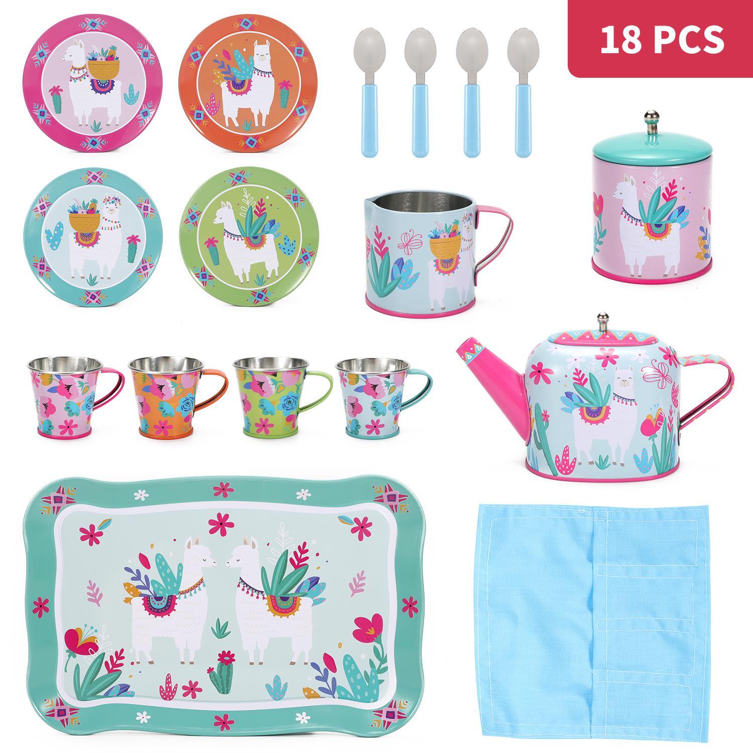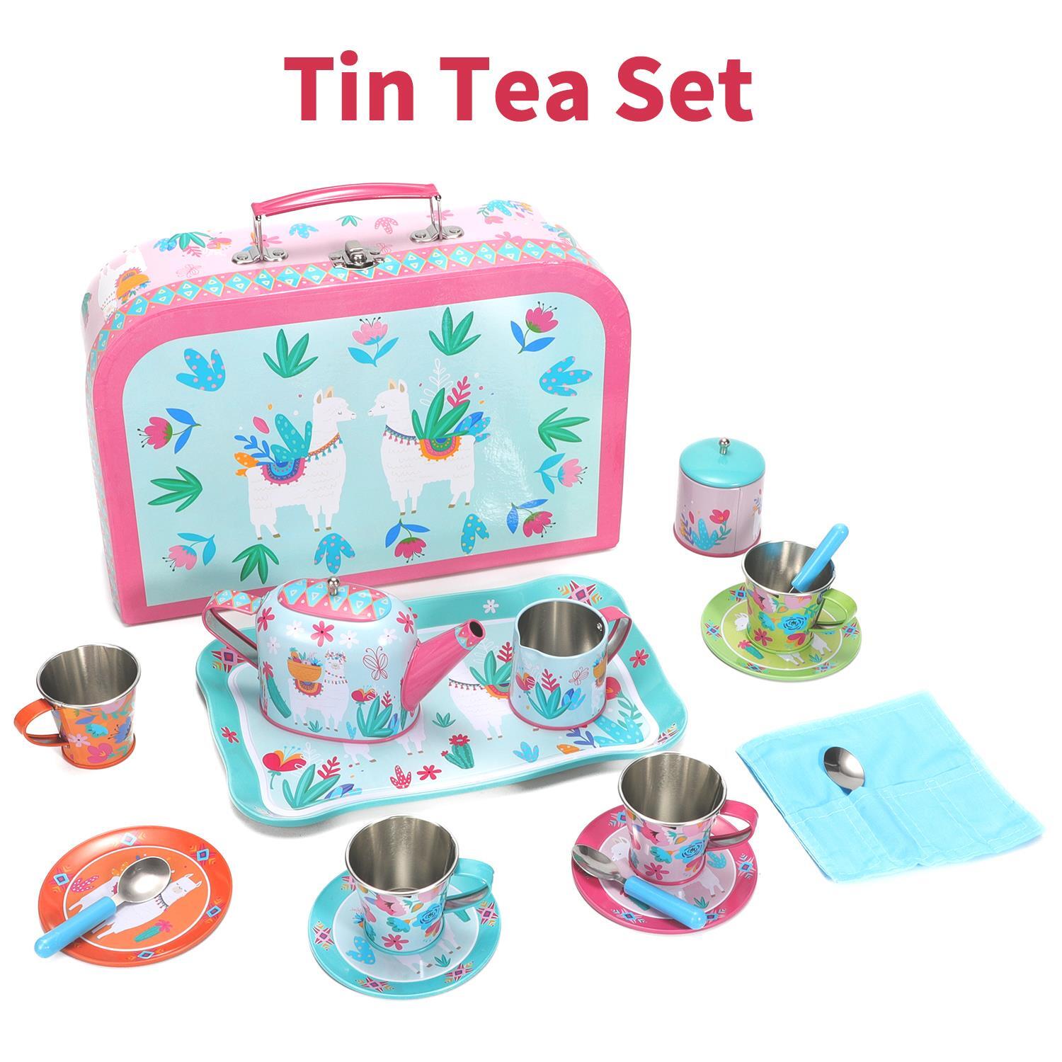 SOKA 18 Pcs Llama Metal Tin Kids Teapot Tea Party Set Carry Case Toy Pretend Role Play ?3 years and up