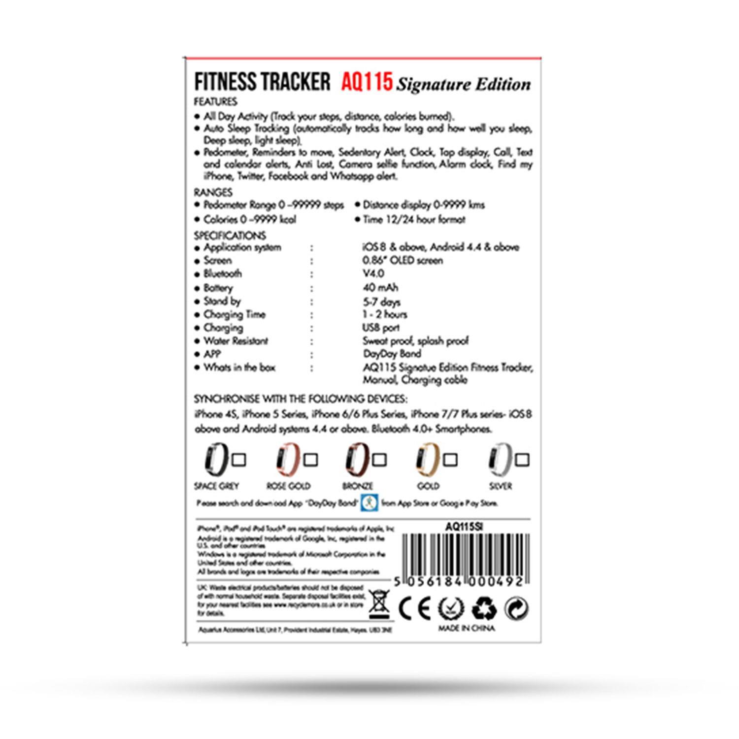 Key Features : All Day Activity (Tracks your steps, distance, calories burned). Auto Sleep Tracking (Automatically tracks how long and how well you sleep, well sleep light sleep). Pedometer, Reminders to Move, Sedentary Alert, Clock, Tap display, Call, Text and calendar alerts, Anti Lost, Camera selfie function, Alarm Clock. Ranges: Pedometer Range 0 - 99999 steps Calories 0 - 9999 Distance display 0 - 9999 km Time 12/24 hour format Product Specifications : Application system : iOS 8 & above, Android 4.4 & above Screen: 0.86'' OLED screen Bluetooth: V4.0 Battery: 40mAh Stand by: 5-7 days Charging Time: 1-2 hours Charging: USB Port Water Resistant: Sweatproof, splash-proof APP: DayDay Band Package Includes: AQ 115 Fitness Tracker, User Manual, Charging Cable