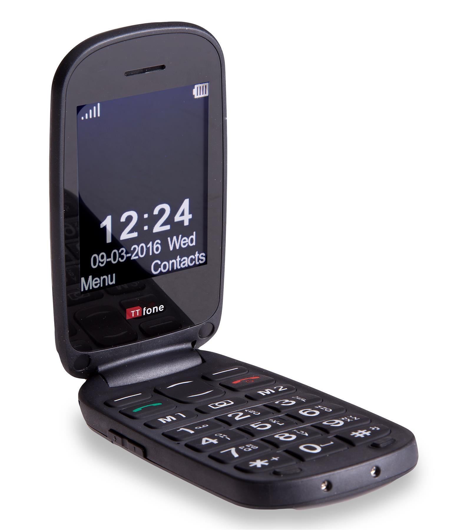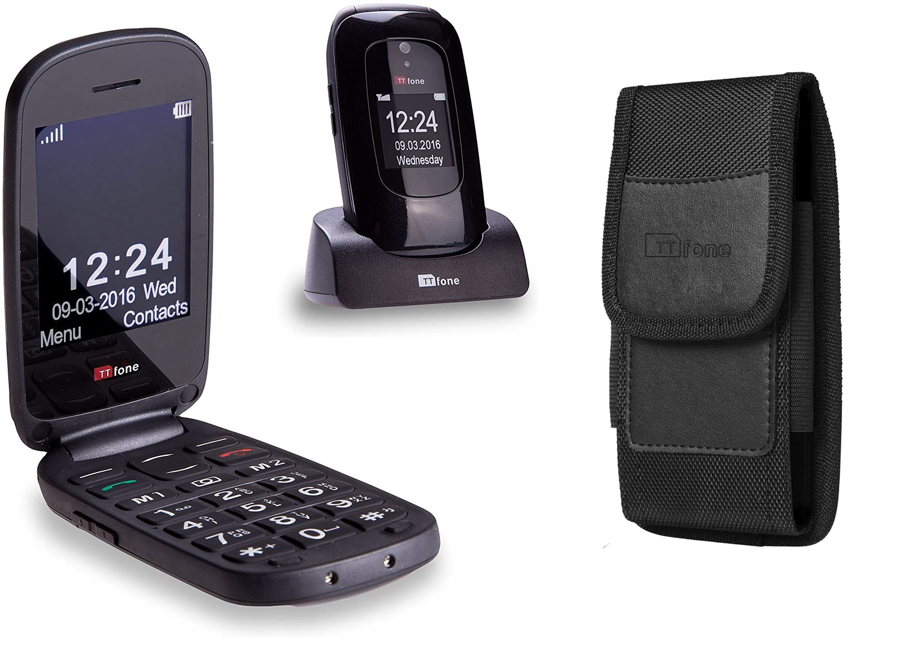 TT750 Lunar BLACK Flip Folding Dual Screen Big Button Mobile Phone & Dock Charger, CB4 Nylon Holster Case & Vodafone Sim Card