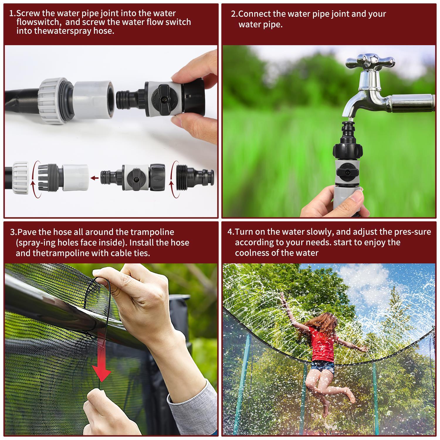 EASY TO INSTALL & USE: It comes with fixing straps to suit any trampoline shell size, has an adjustable on-off valve design to control water pressure, and can be easily installed basically by attaching the hose on the outside of the trampoline net.