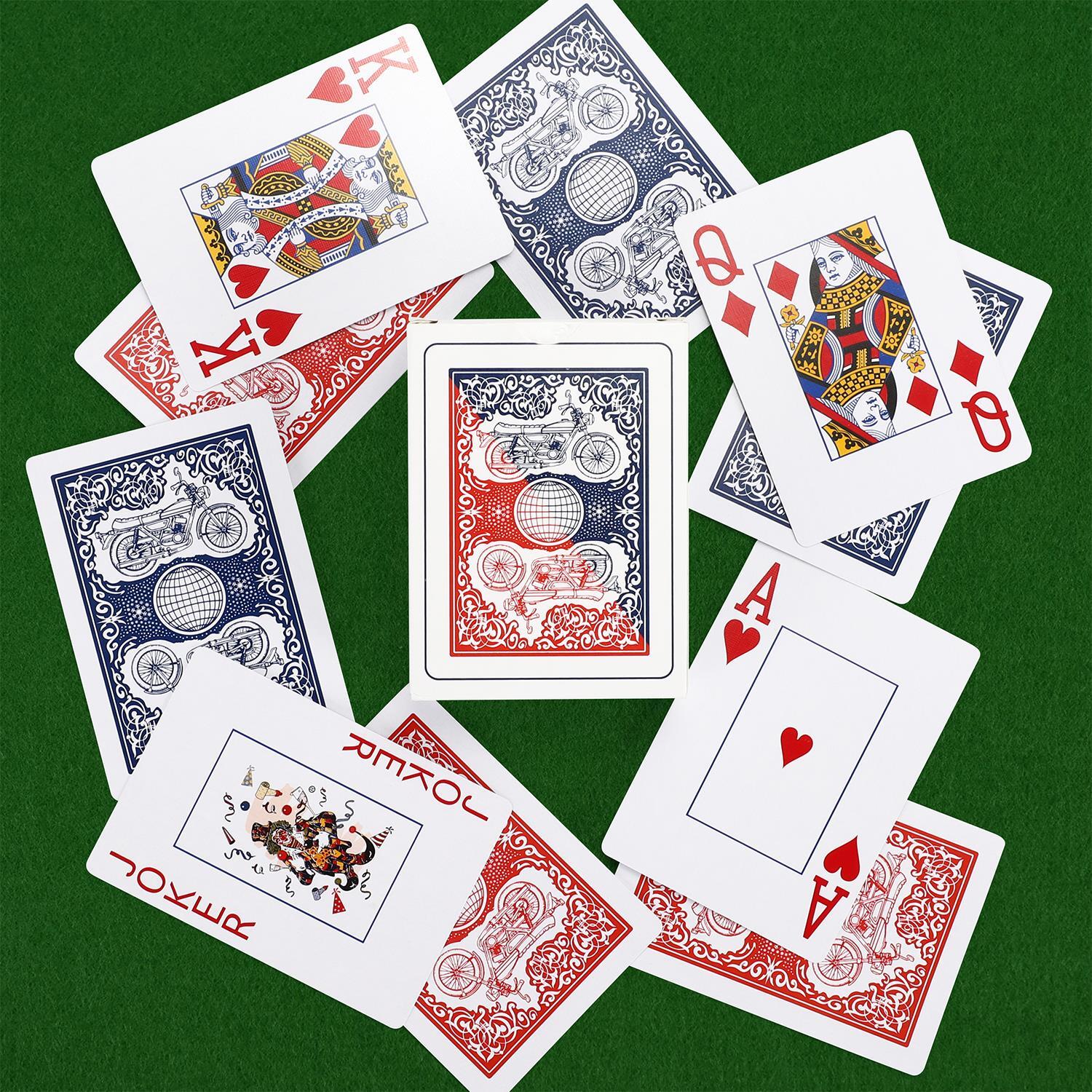 DESIGN: All cards have a motorbike design backing with standard card faces and come in red and blue decks.