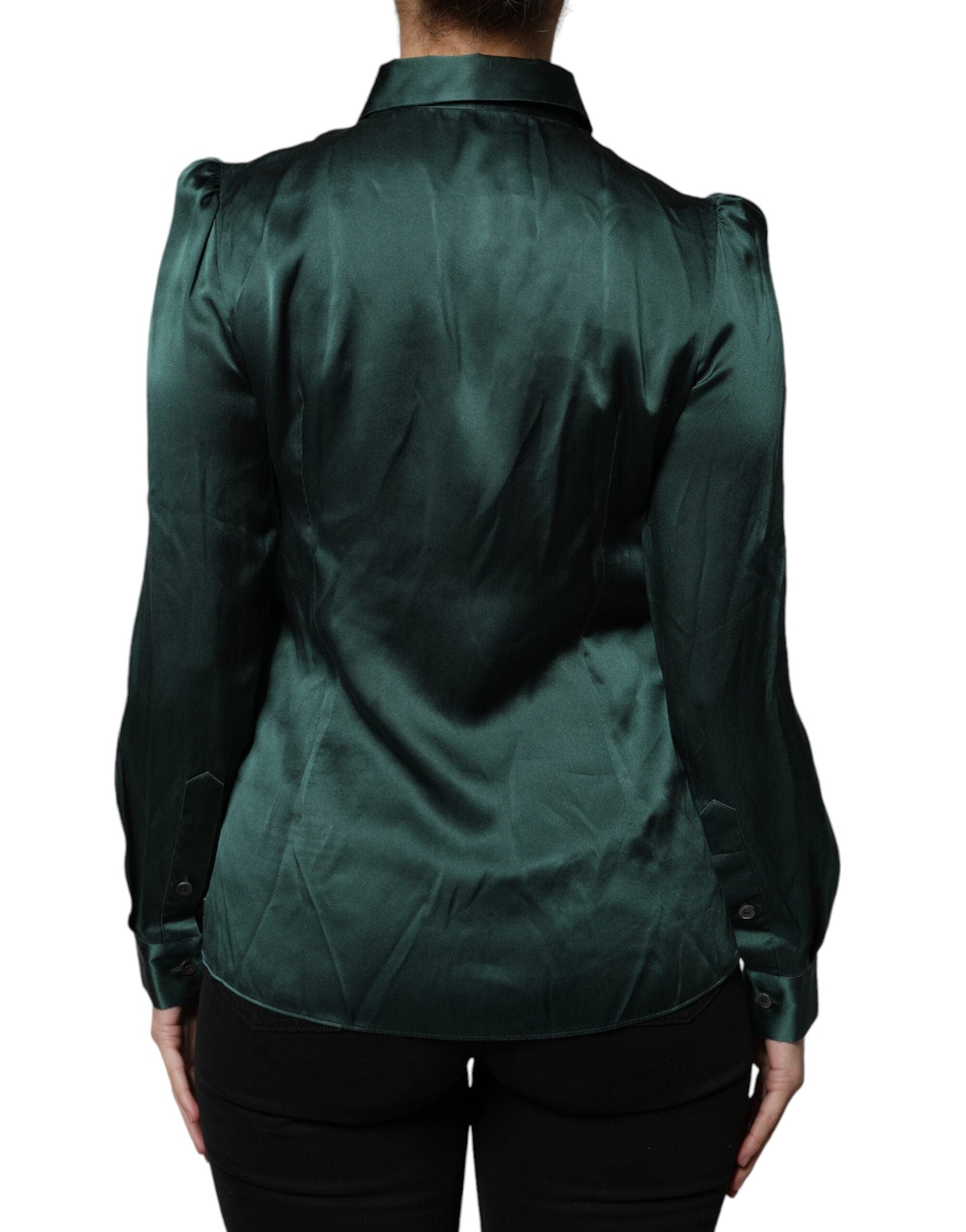 Dark Green Silk Button Down Long Sleeves Blouse Top