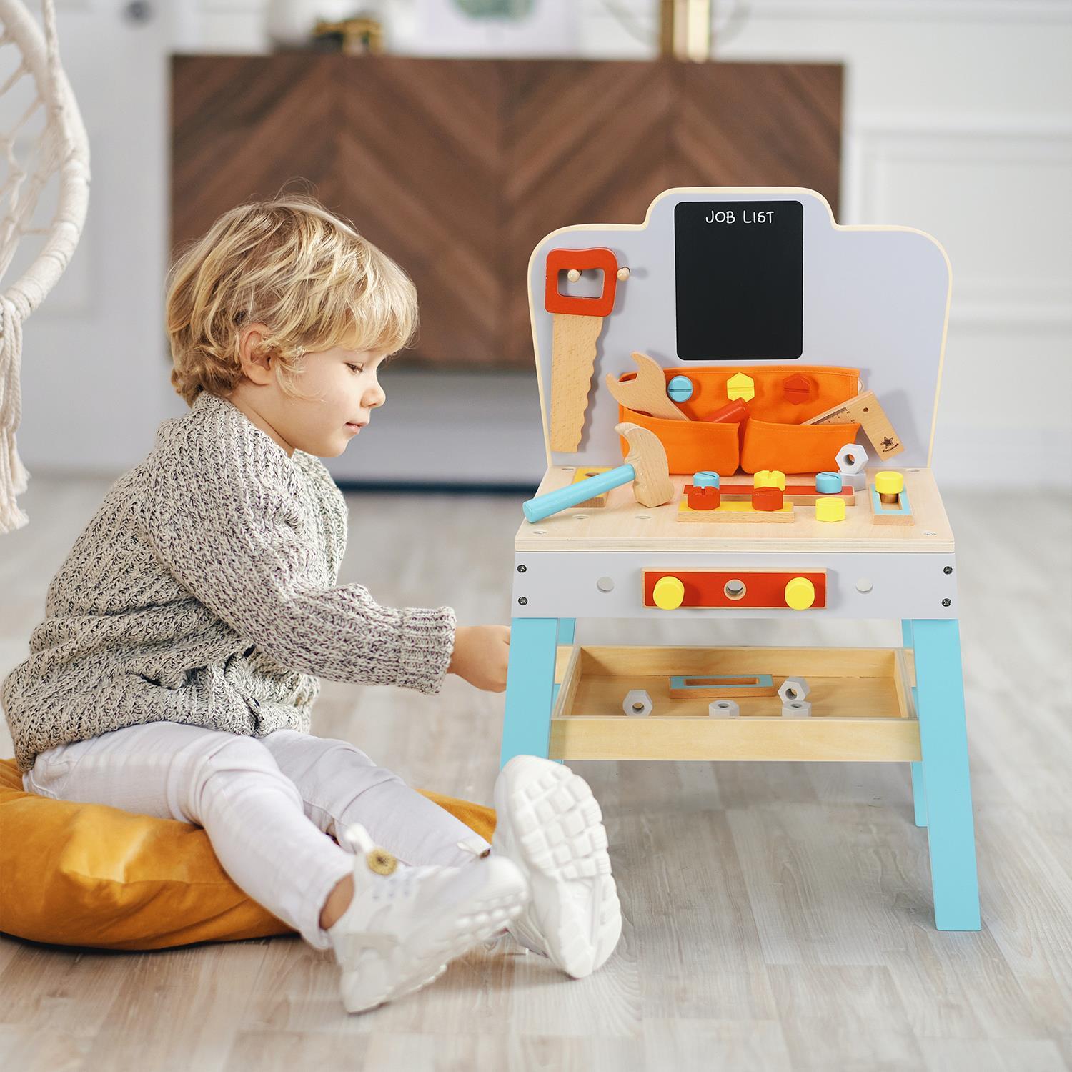 GET FIXING TODAY!: This toy is for little builders who want to use DIY tools just like daddy. Each item is made from wood in chunky sizes and bright colours, especially for small hands. SOKA My First Workbench will give children hours of pretend play fixing up around the house.BENEFITS & DEVELOPMENT - Imitating grown-ups' behaviour is essential for a child's development and upbringing. This toolbox playset will encourage little ones to learn via role-playing and develop their social skills, hand-eye coordination, and enhance their imagination! A fun and educational wooden workstation that allows them to invent and create wonderful stories.COMPREHENSIVE SET - Supply young handymen with all of the basic tools they will need to create and repair things, such as actual-looking screws, nuts, hammers, spanners, screwdriver, ruler, a tool bag, and a saw. This children's workbench set includes 34 pieces in total. A range of tools can be used in combination or separately.CERTIFIED QUALITY: All SOKA Toys are tested to the highest safety standards and comply with the international toy safety standards. SOKA toys are made from renewable resources with non-toxic paints & lacquers. This product is made from wood.IDEAL GIFT: SOKA toys come in an elegant packaging so whether it's a birthday, Christmas, or any other occasion, and you can't go wrong when it comes to gifting a kid. Note* Not Suitable for children under 36 months.