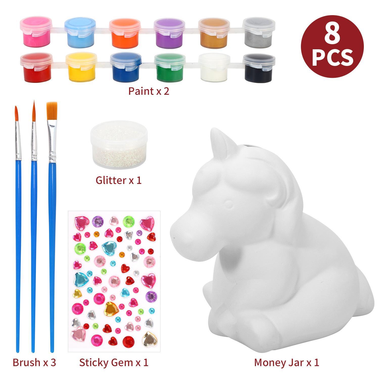 COMPLETE CRAFT KIT: This craft kit includes 1 unicorn money bank with horn, mane, and tail, 1 sheet of sticky gems to embellish it, 3 brushes, and 12 non-toxic vibrant coloured paints. Everything your youngster needs to do is design a one-of-a-kind bank that they will be pleased to display as their own!