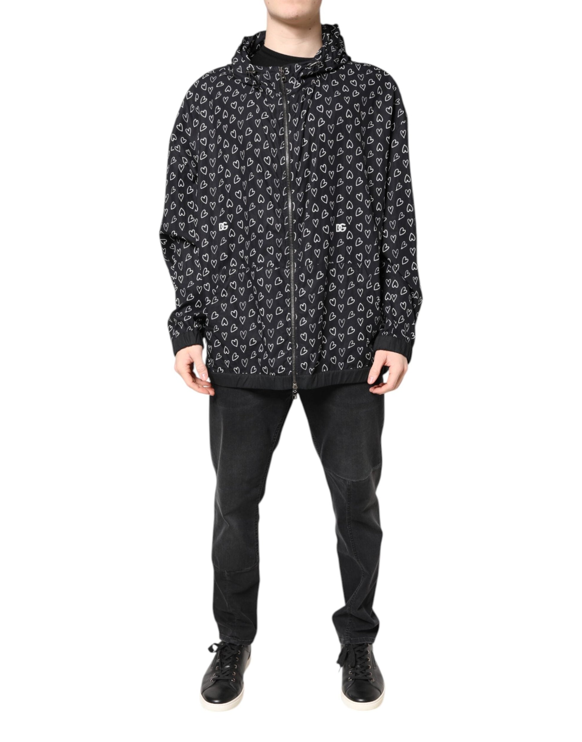 Black Heart Print Hooded Windbreaker Jacket